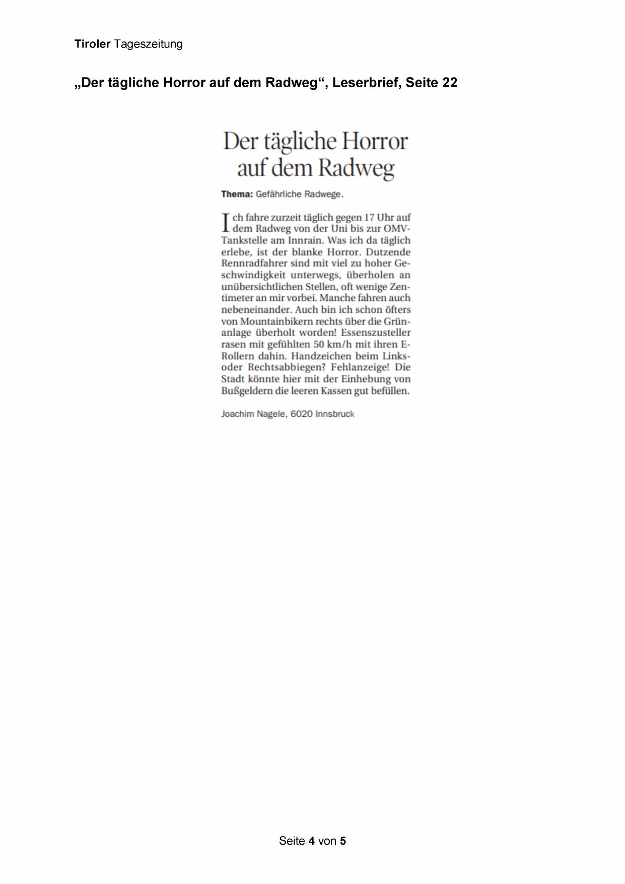 „Der tägliche Horror auf dem Radweg“, Leserbrief, Seite 22
