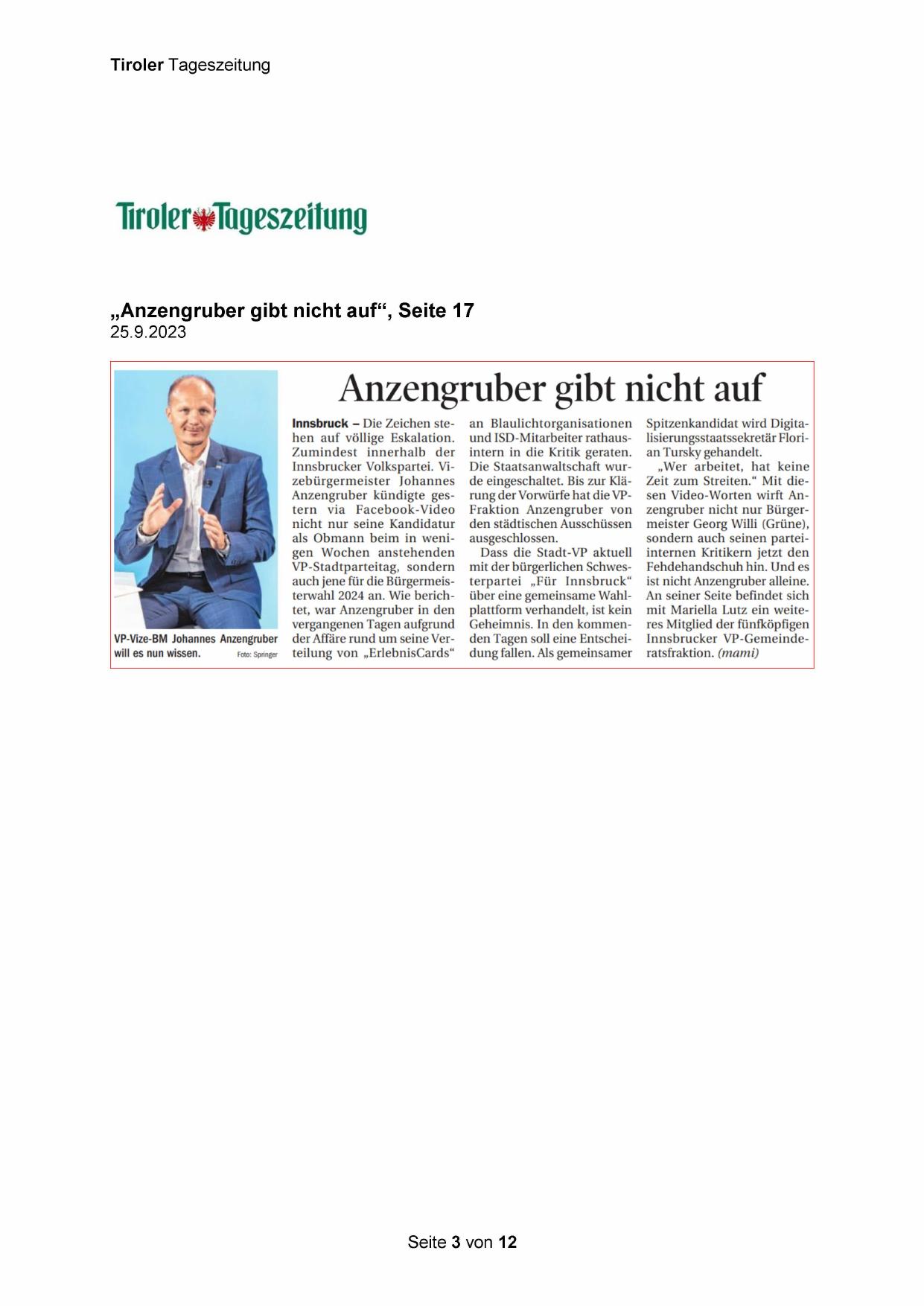 Innsbrucker Volkspartei. Vizebürgermeister Johannes