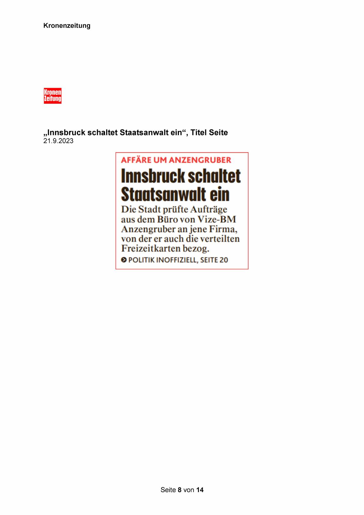 „Innsbruck schaltet Staatsanwalt ein“, Titel Seite