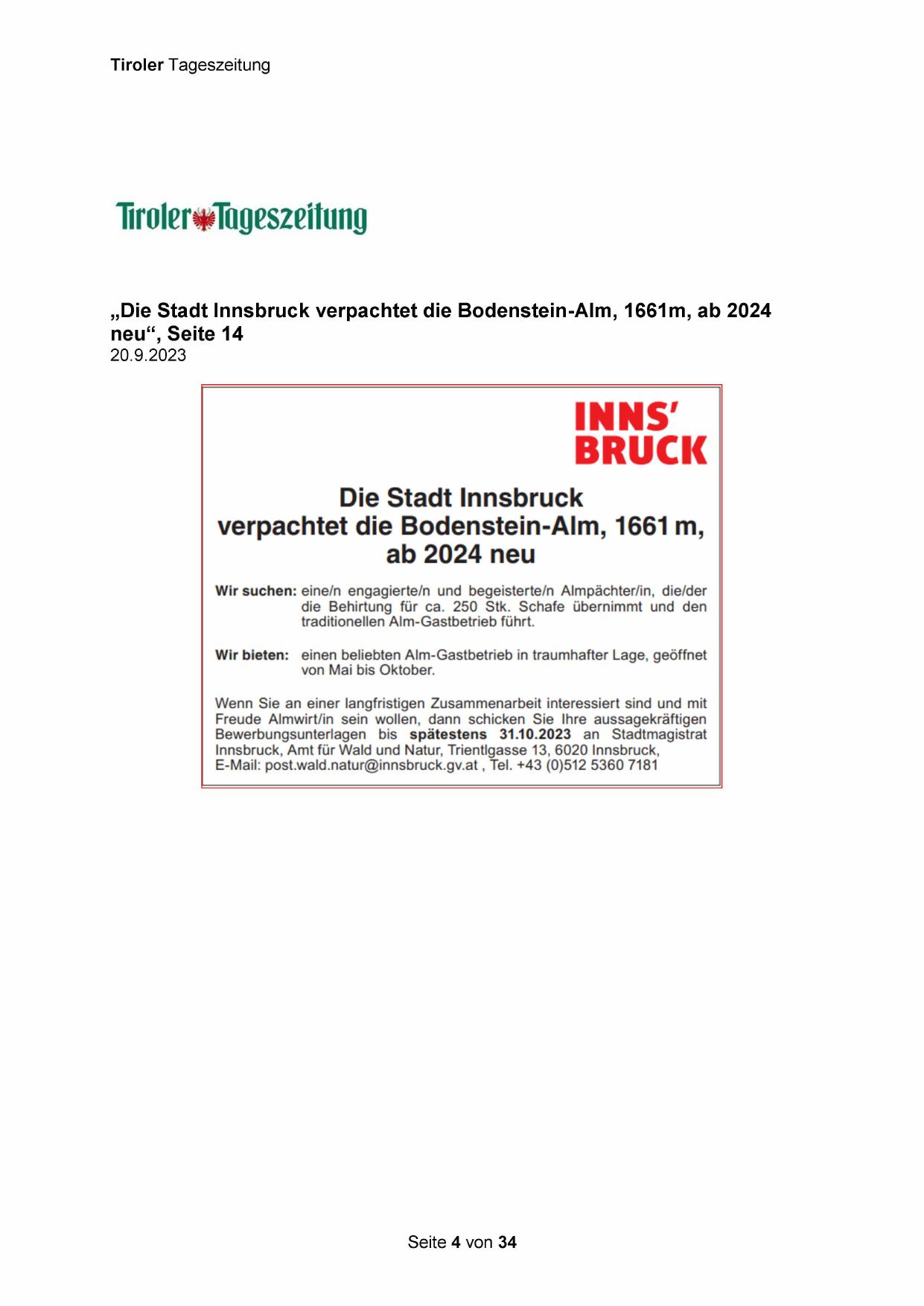 „Die Stadt Innsbruck verpachtet die Bodenstein-Alm, 1661m, ab 2024