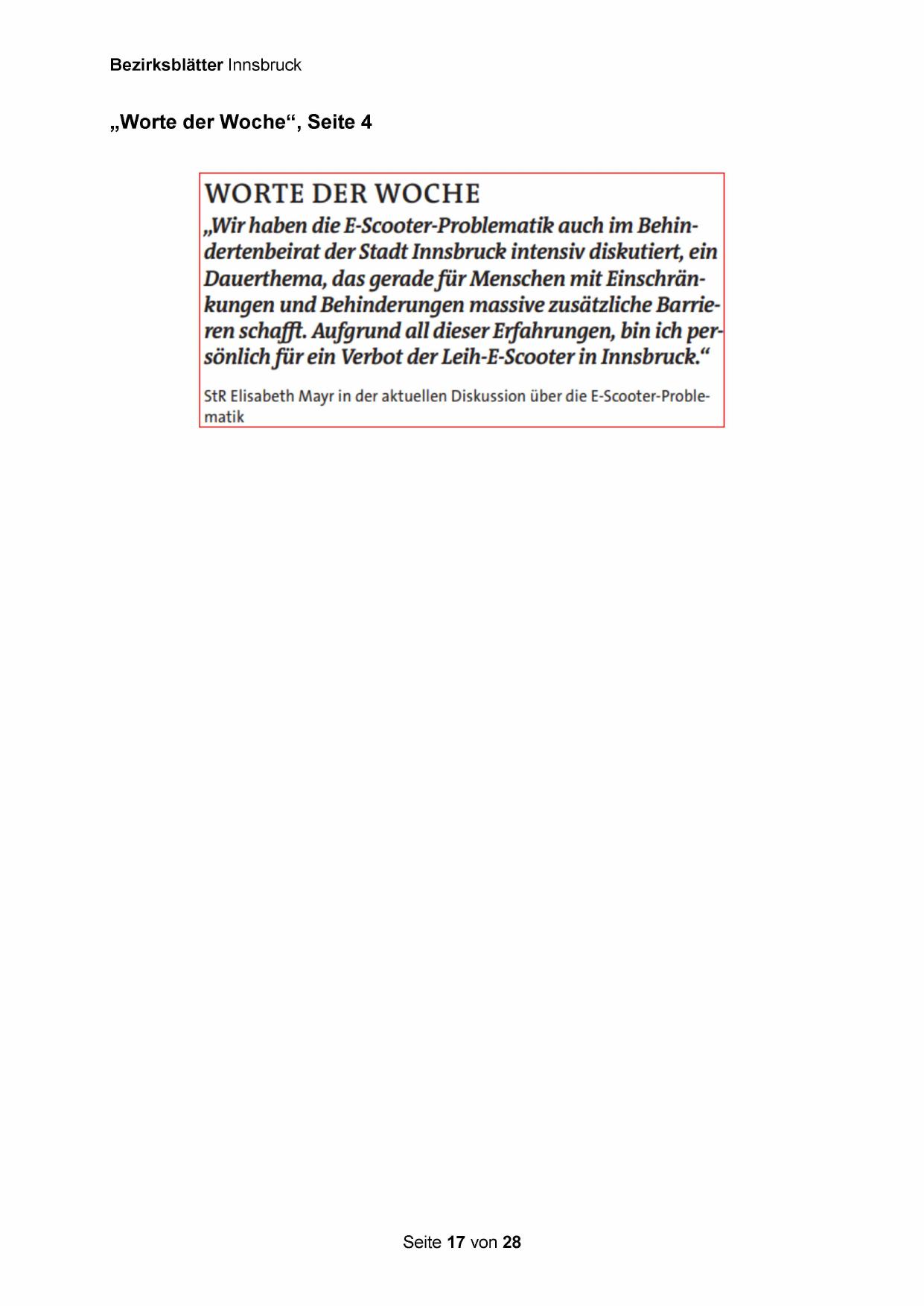 Dauerthema, das gerade für Menschen mit Einschränkungen und Behinderungen massive zusätzliche Barrieren schafft. Aufgrund all dieser Erfahrungen, bin ich persönlich für ein Verbot der Leih-E-Scooter in Innsbruck.“