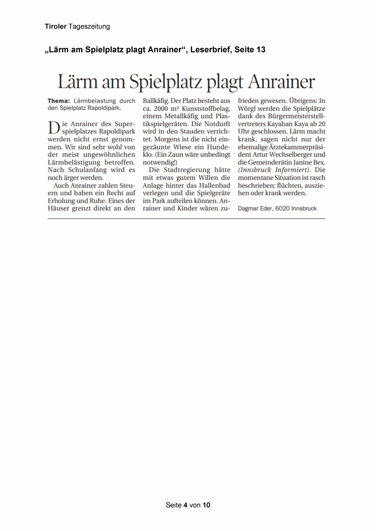 „Lärm am Spielplatz plagt Anrainer“, Leserbrief, Seite 13