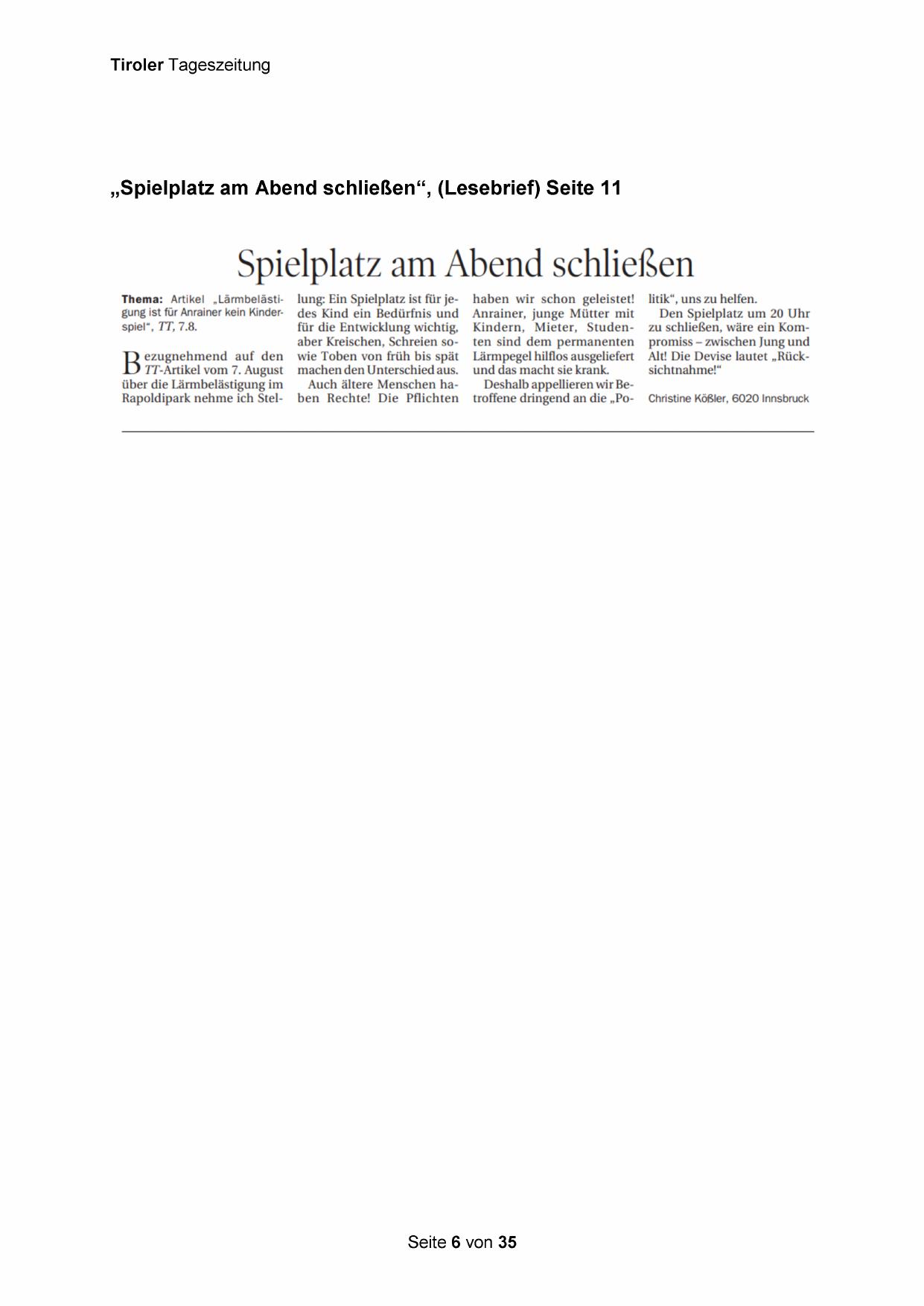 Thema: Artikel „Lärmbelästigung ist für Anrainer kein Kinderspiel“, TT, 7.8.
