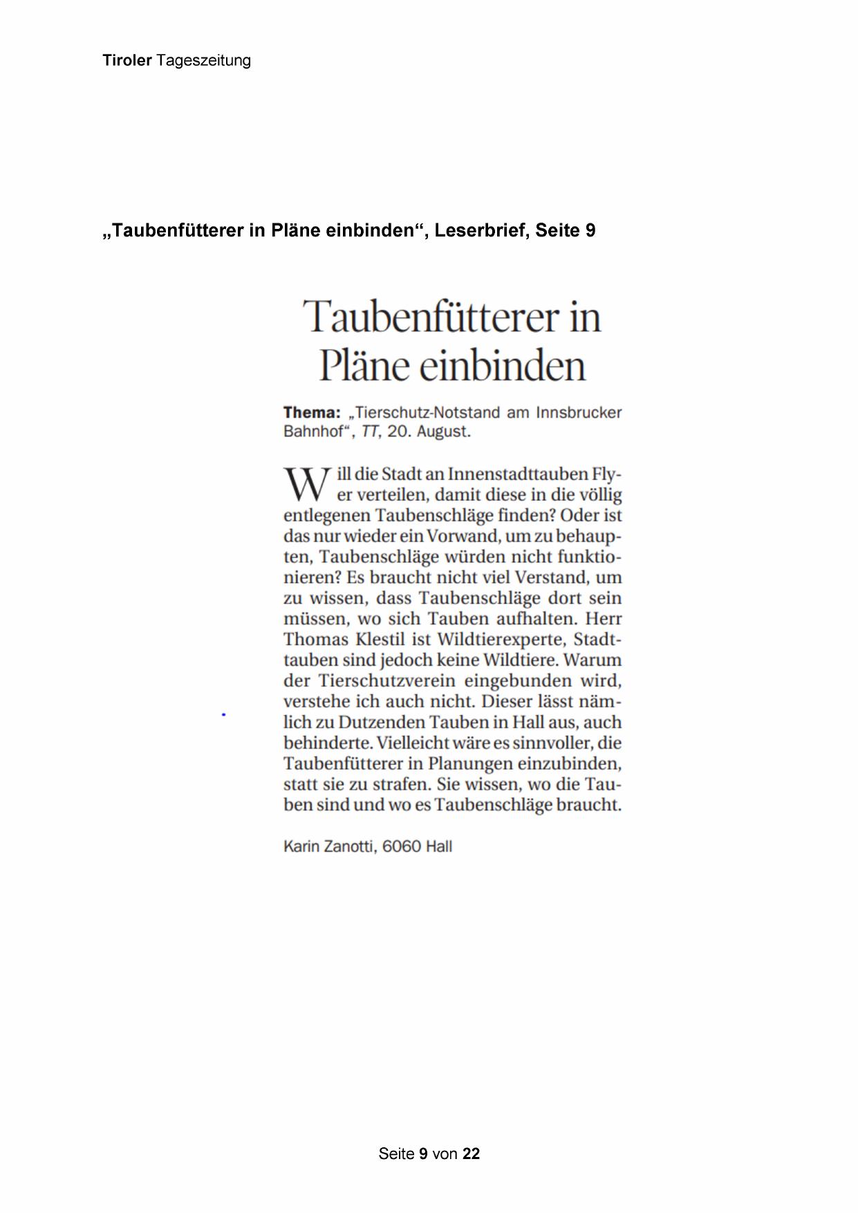 „Taubenfütterer in Pläne einbinden“, Leserbrief, Seite 9