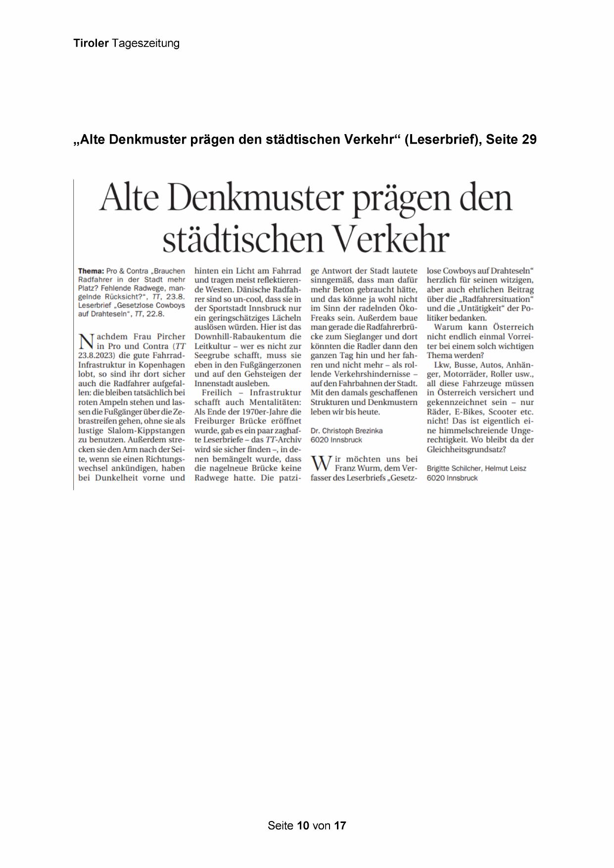 „Alte Denkmuster prägen den städtischen Verkehr“ (Leserbrief), Seite 29
