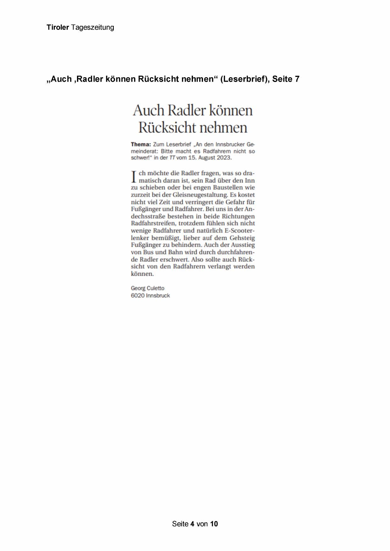 Thema: Zum Leserbrief „An den Innsbrucker Gemeinderat: Bitte macht es Radfahrem nicht so