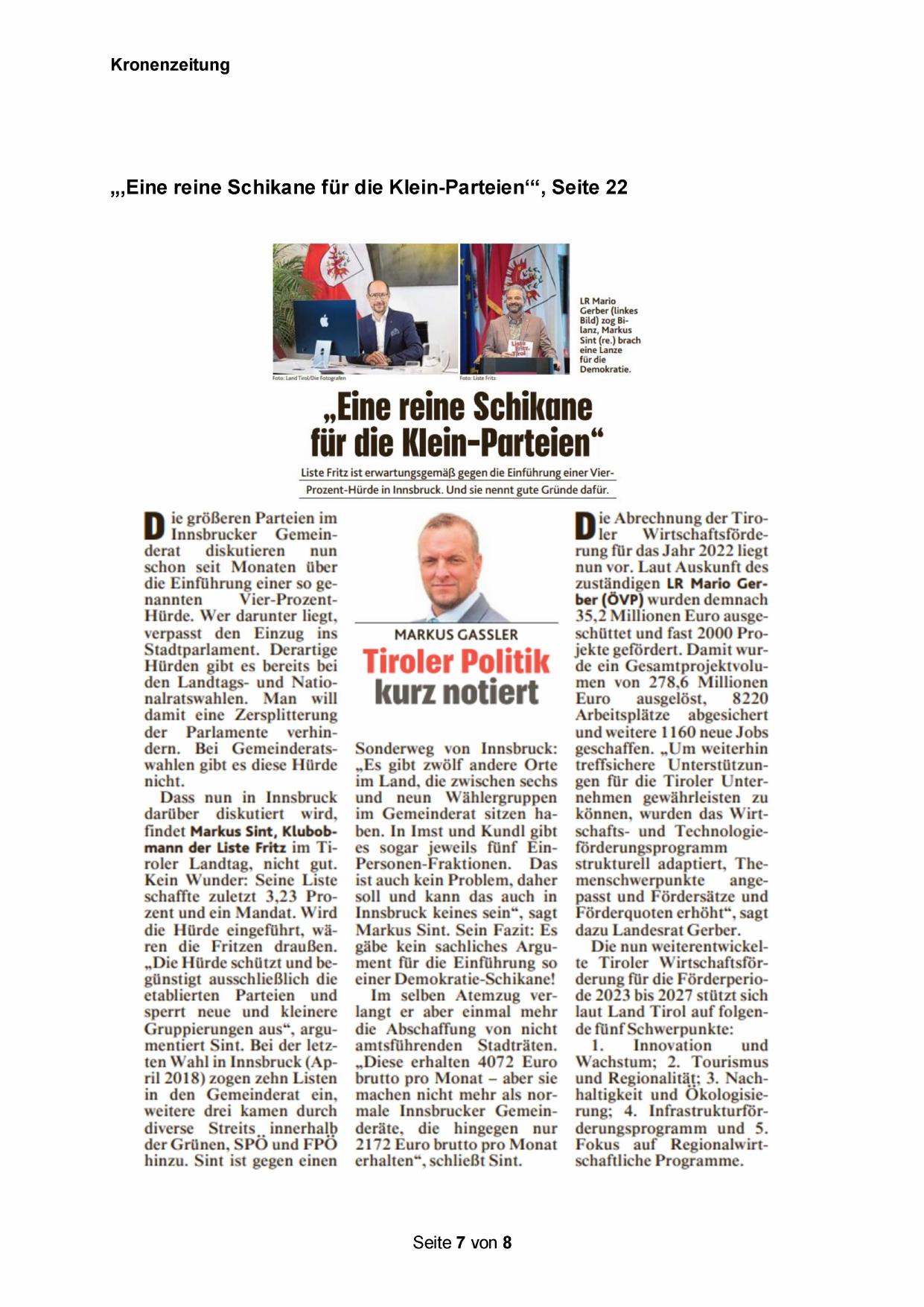 Gruppierungen aus“, argumentiert Sint. Bei der letzten Wahl in Innsbruck (April 2018) zogen zehn Listen