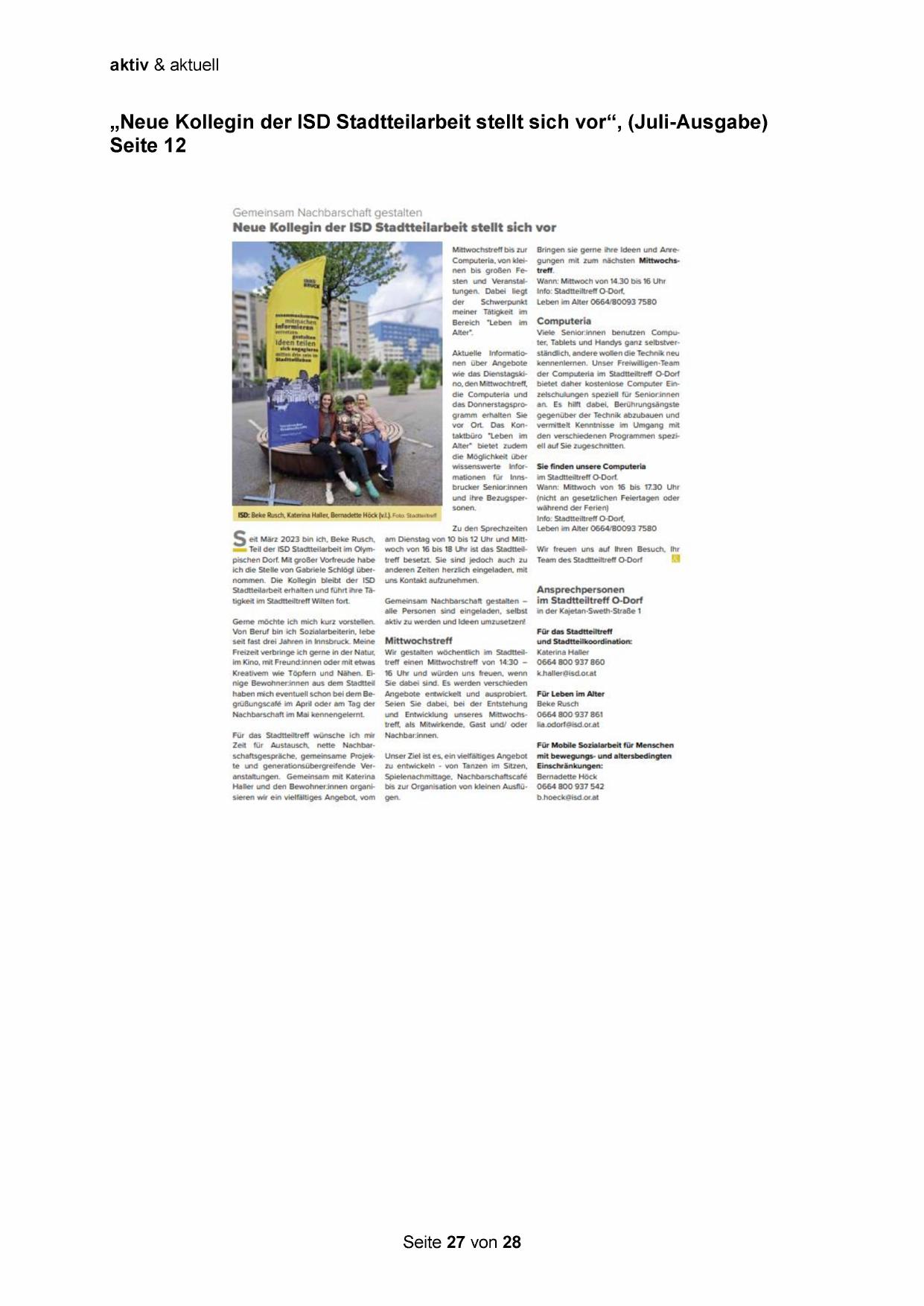 „Neue Kollegin der ISD Stadtteilarbeit stellt sich vor“, (Juli-Ausgabe)