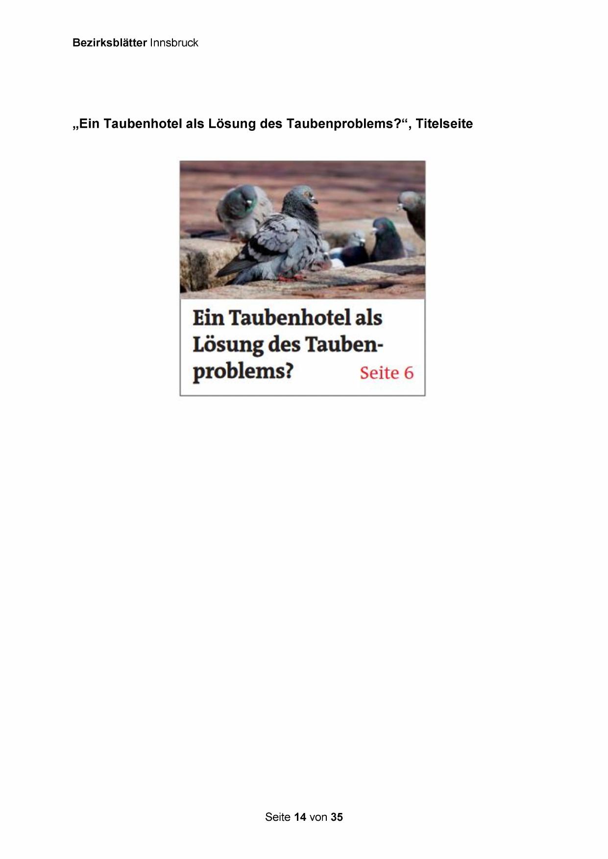 „Ein Taubenhotel als Lösung des Taubenproblems?“, Titelseite
