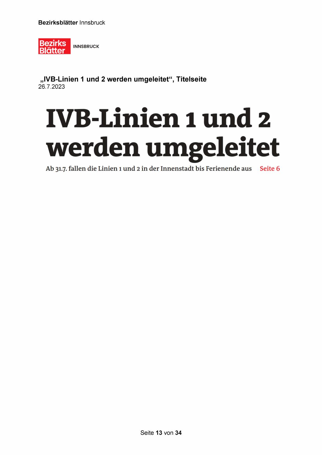 „IVB-Linien 1 und 2 werden umgeleitet“, Titelseite