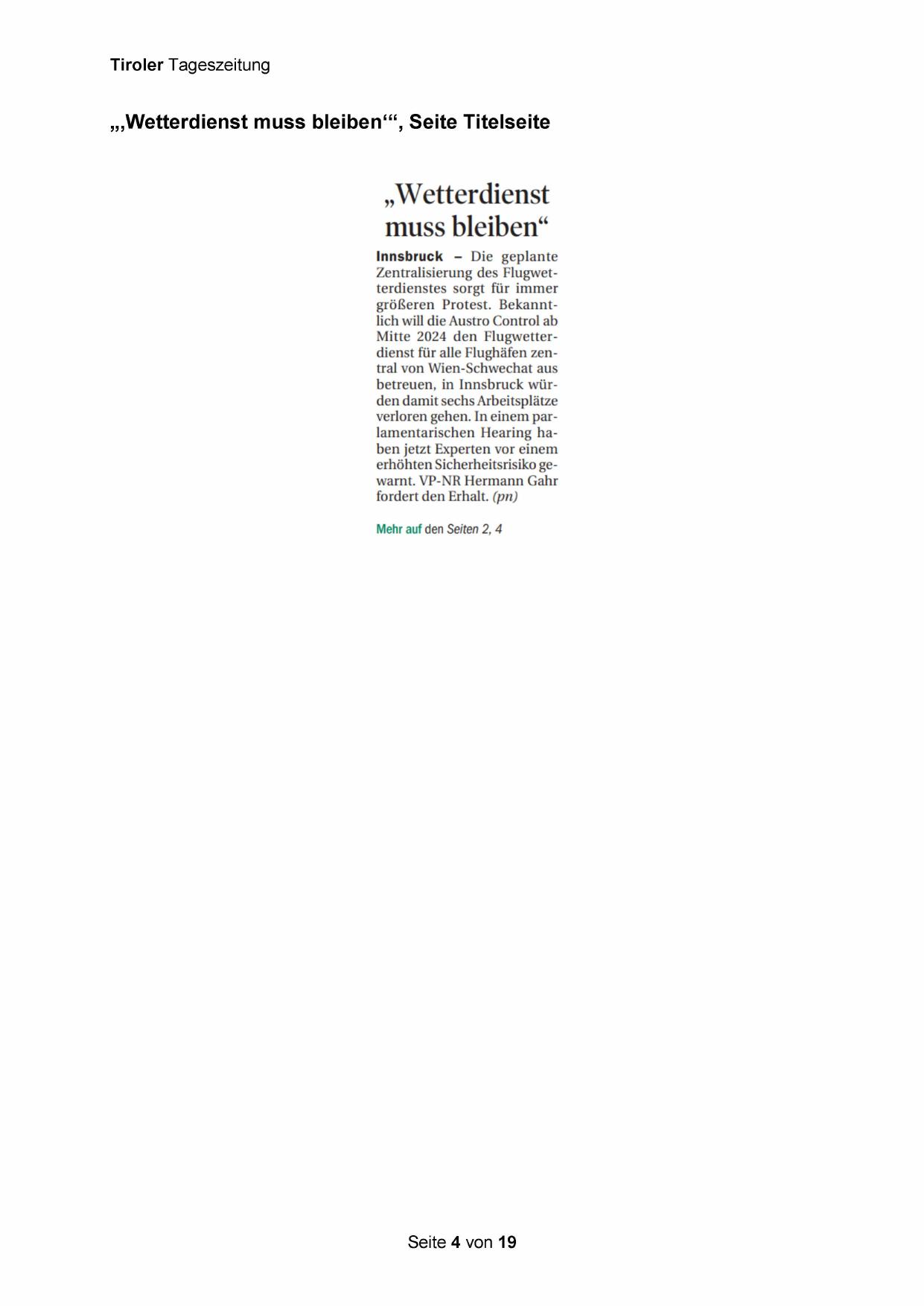 „‚Wetterdienst muss bleiben‘“, Seite Titelseite