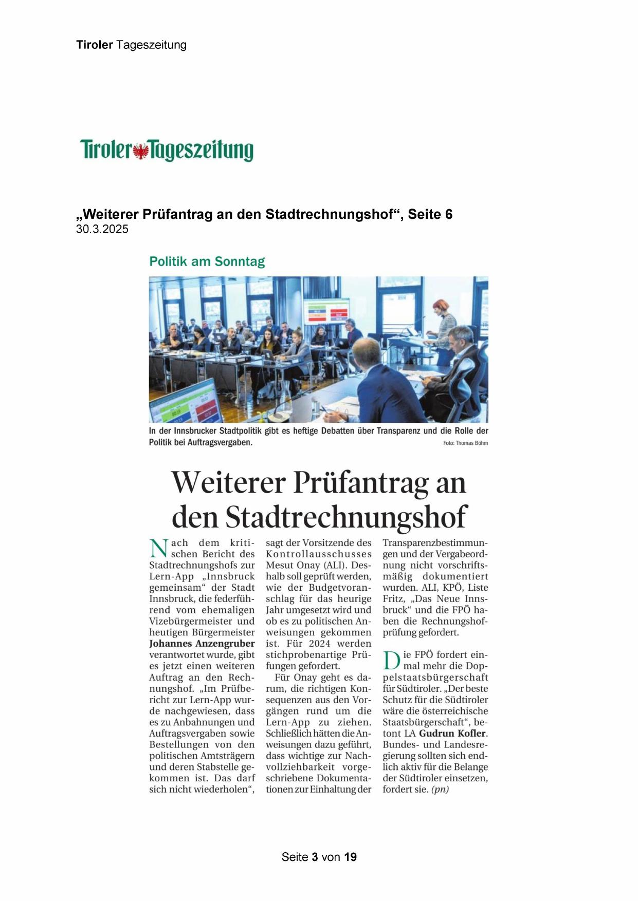 Fritz, „Das Neue Innsbruck“ und die FPÖ haben die Rechnungshofprüfung gefordert.