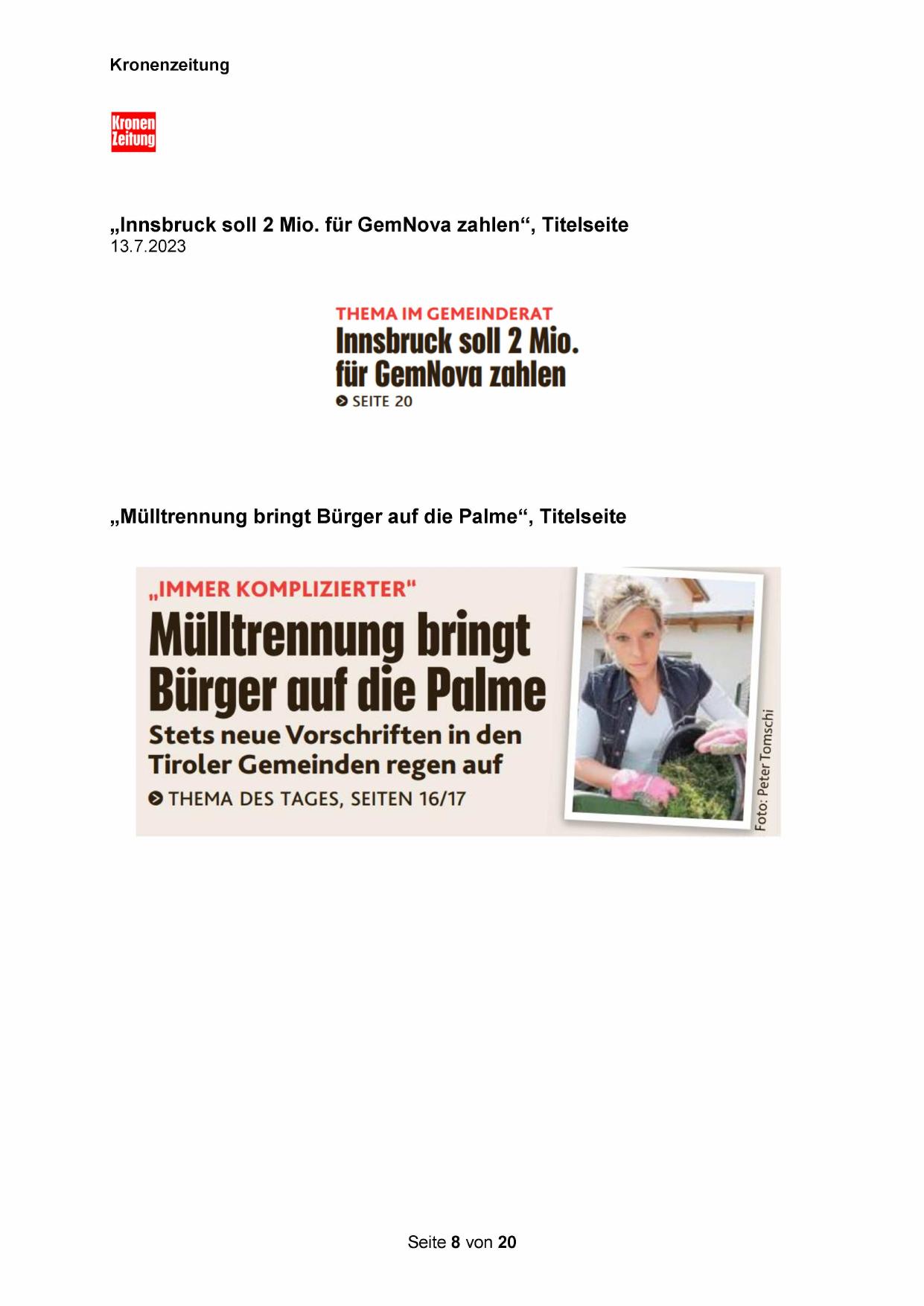 „Innsbruck soll 2 Mio. für GemNova zahlen“, Titelseite
