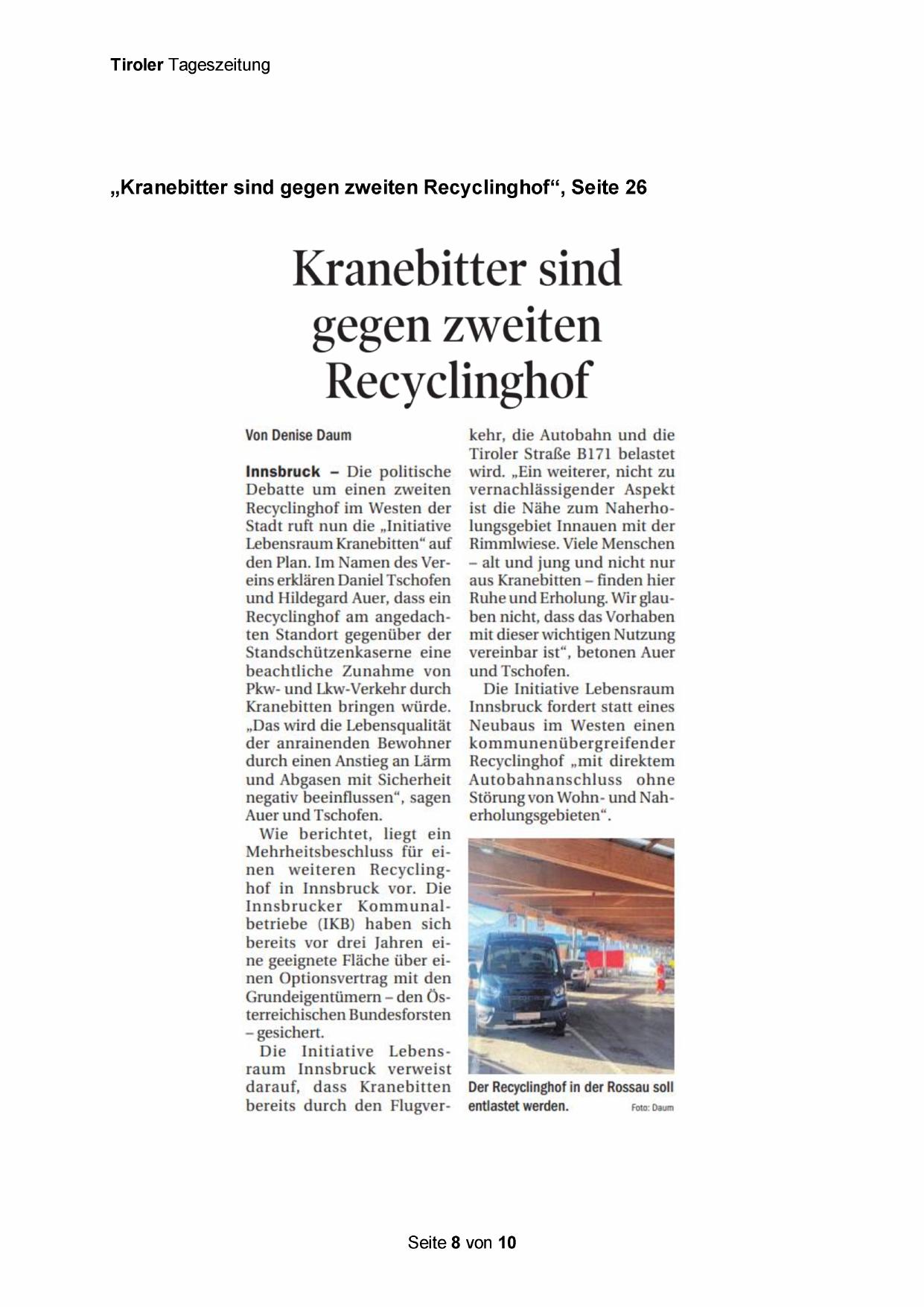 „Kranebitter sind gegen zweiten Recyclinghof“, Seite 26