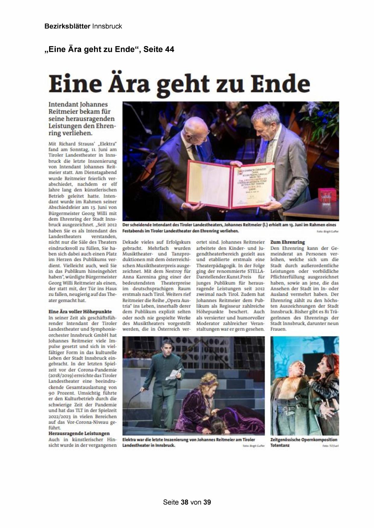Der scheidende Intendant des Tiroler Landestheaters, Johannes Reitmeier (1.) erhielt am 13. Juni im Rahmen eines