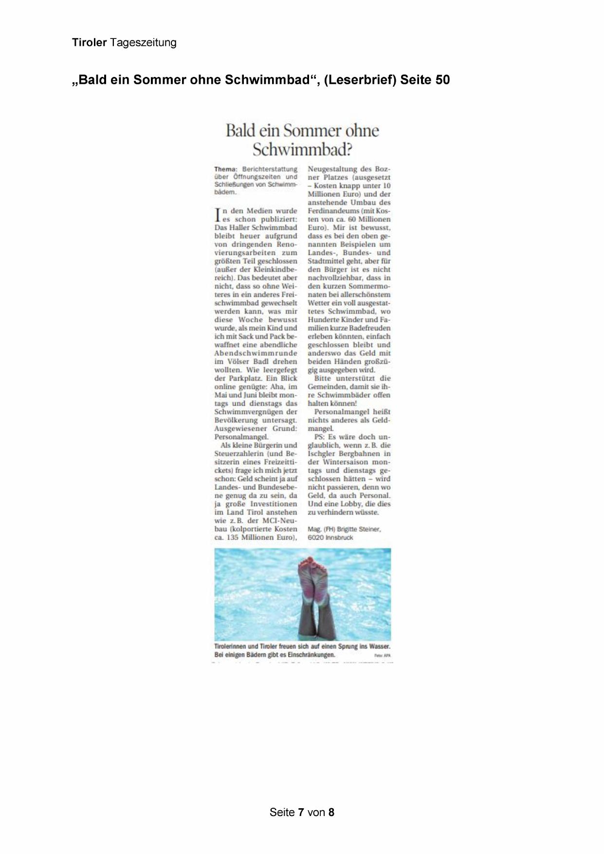 „Bald ein Sommer ohne Schwimmbad“, (Leserbrief) Seite 50