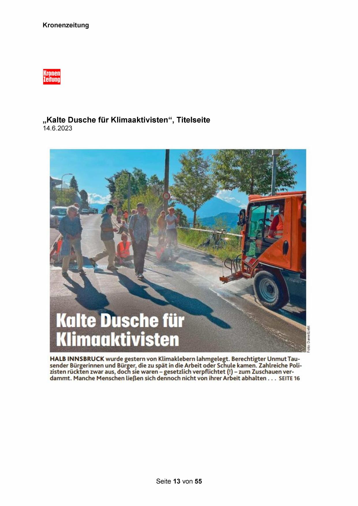 HALB INNSBRUCK wurde gestern von Klimaklebern lahmgelegt. Berechtigter Unmut Tausender Bürgerinnen und Bürger, die zu spät in die Arbeit oder Schule kamen. Zahlreiche Polizisten rückten zwar aus, doch sie waren - gesetzlich verpflichtet (!) - zum Zuschauen verdammt. Manche Menschen ließen sich dennoch nicht von ihrer Arbeit abhalten . . . SEITE 16