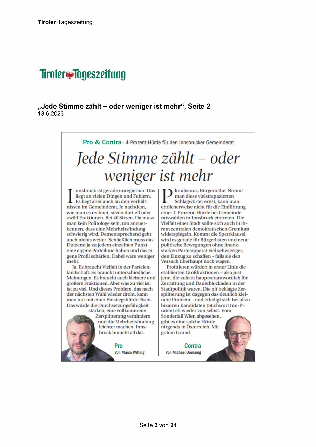 einer 4-Prozent-Hürde bei Gemeinderatswahlen in Innsbruck eintreten. Die