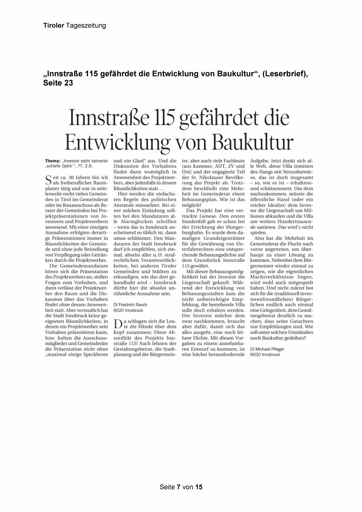 „Innstraße 115 gefährdet die Entwicklung von Baukultur“, (Leserbrief),