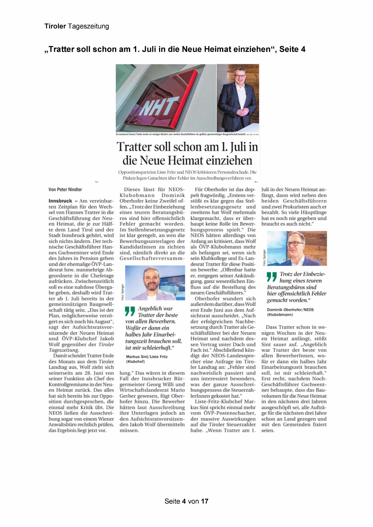 Oppositionsparteien Liste Fritz und NEOS kritisieren Personalrochade. Die