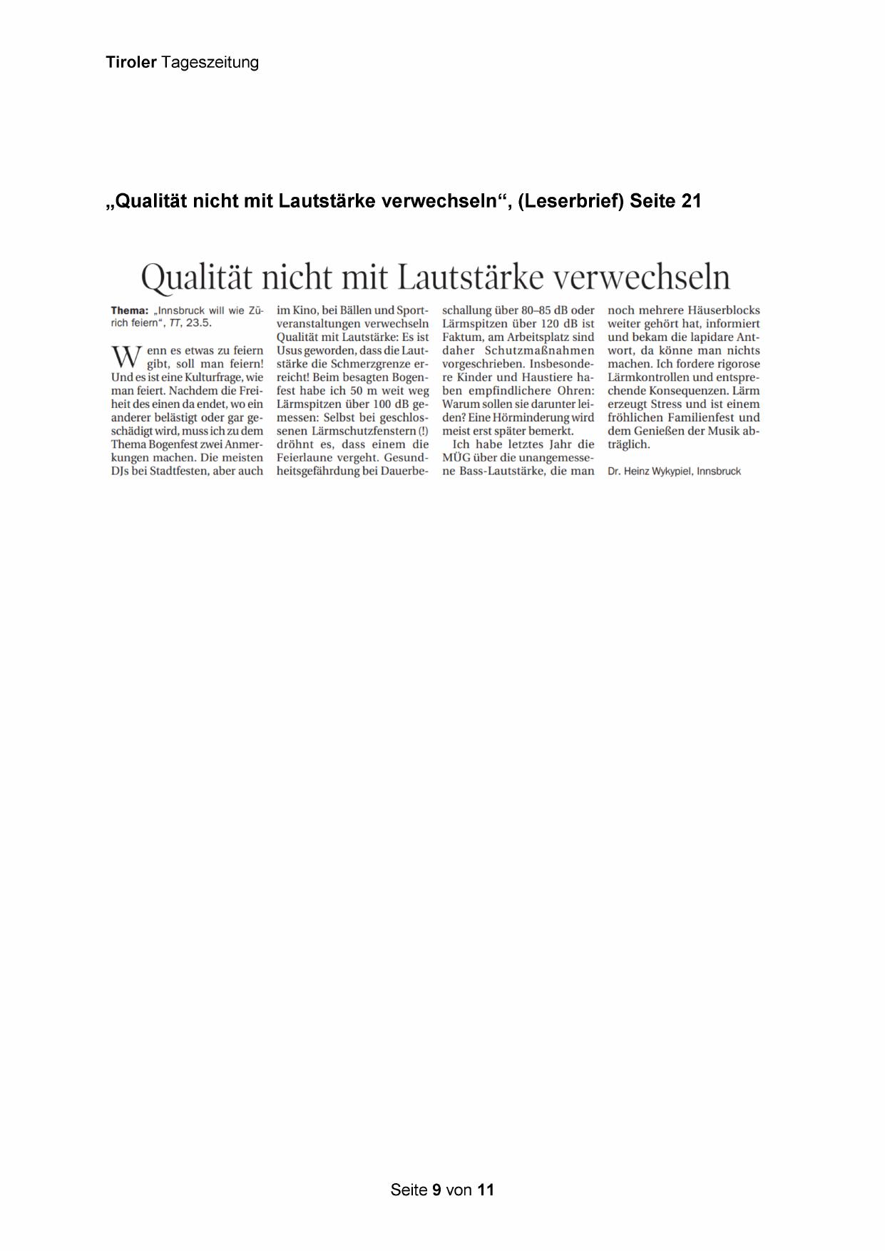 „Qualität nicht mit Lautstärke verwechseln“, (Leserbrief) Seite 21