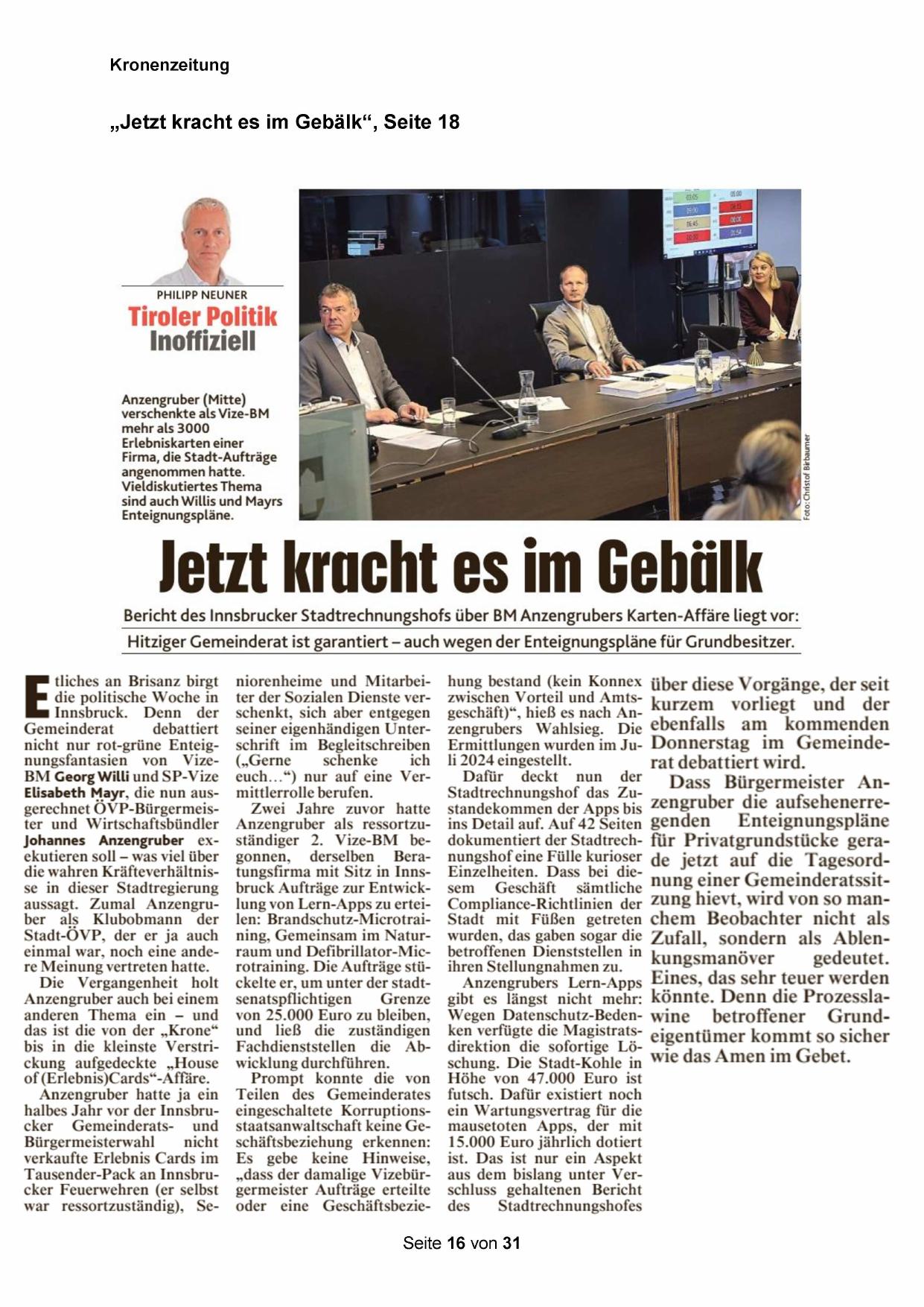 Bericht des Innsbrucker Stadtrechnungshofs über BM Anzengrubers Karten-Affäre liegt vor: