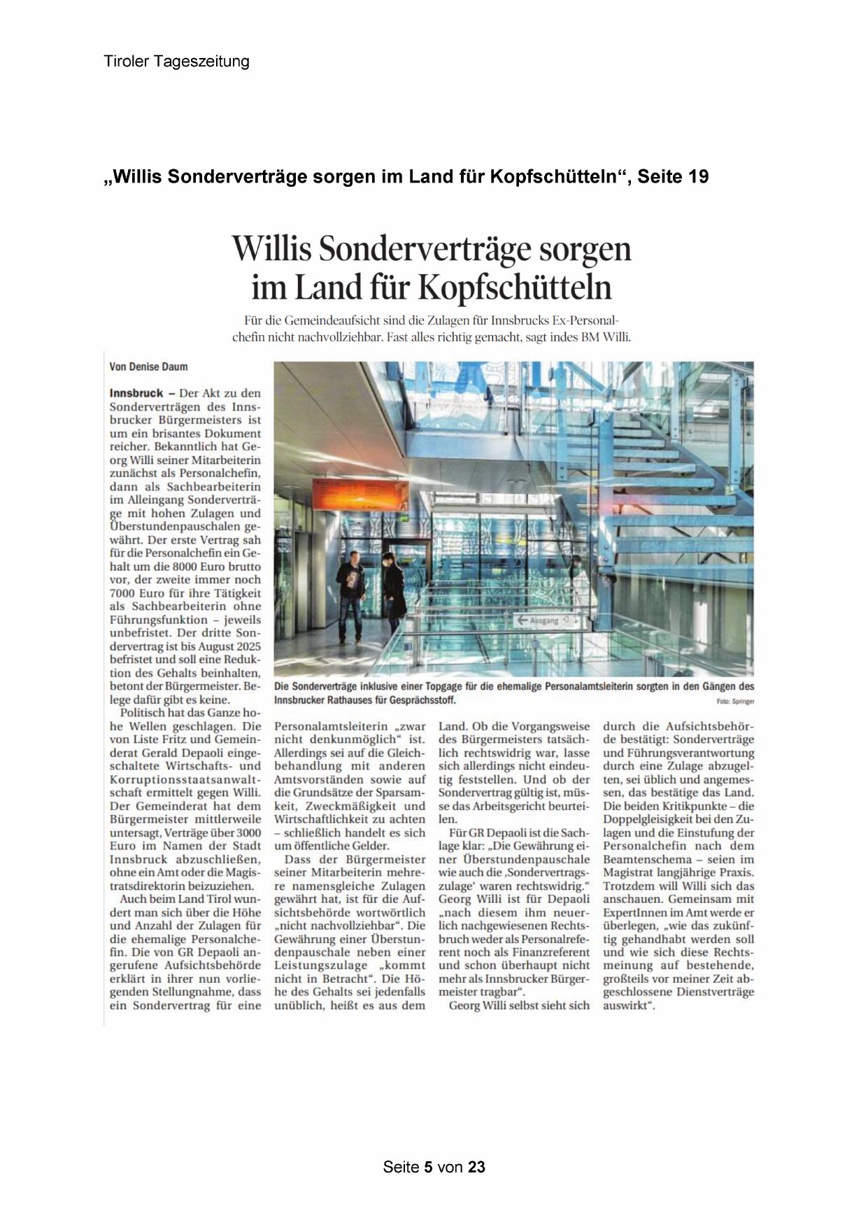 Für die Gemeindeaufsicht sind die Zulagen für Innsbrucks Ex-Personalchefin nicht nachvollziehbar. Fast alles richtig gemacht, sagt indes BM Willi.