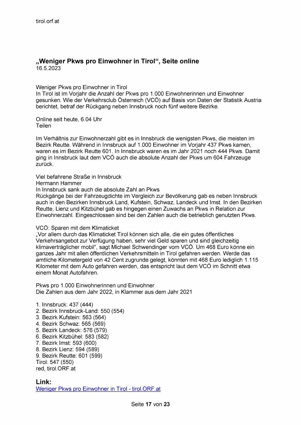 „Weniger Pkws pro Einwohner in Tirol“, Seite online