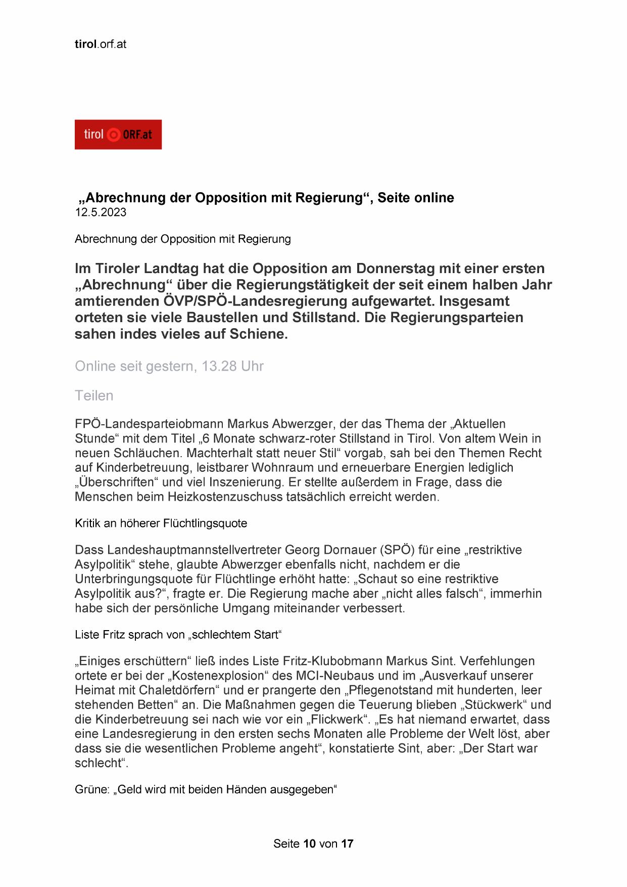 „Abrechnung der Opposition mit Regierung“, Seite online