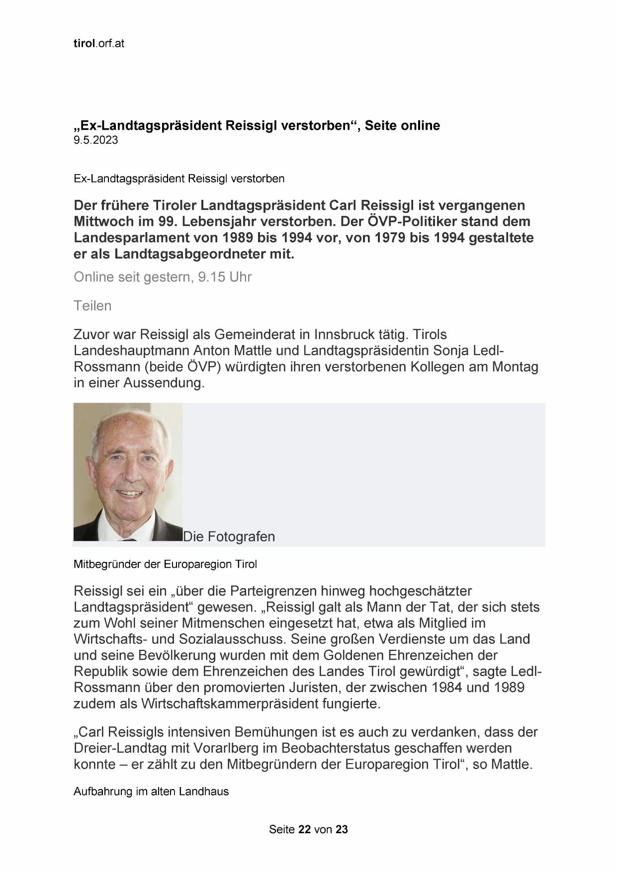 „Ex-Landtagspräsident Reissigl verstorben“, Seite online