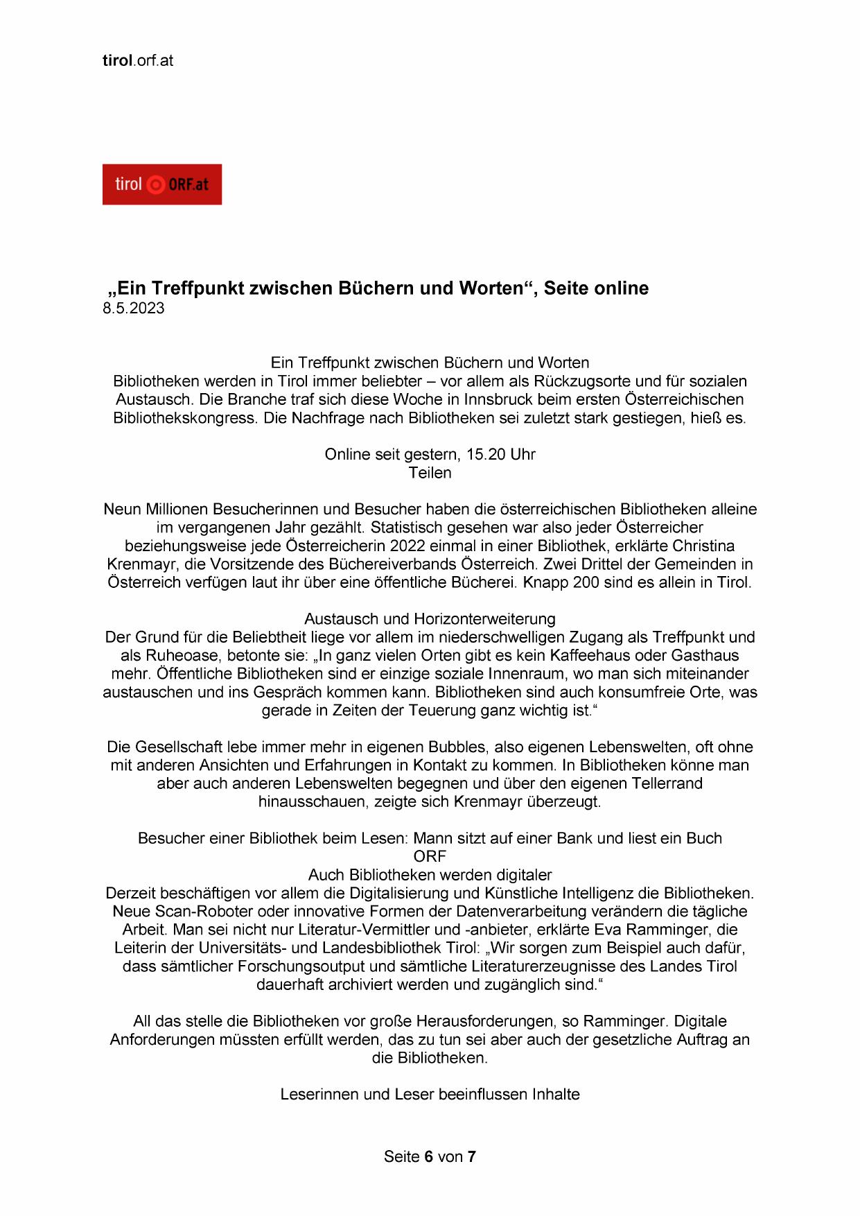 Österreich verfügen laut ihr über eine öffentliche Bücherei. Knapp 200 sind es allein in Tirol.