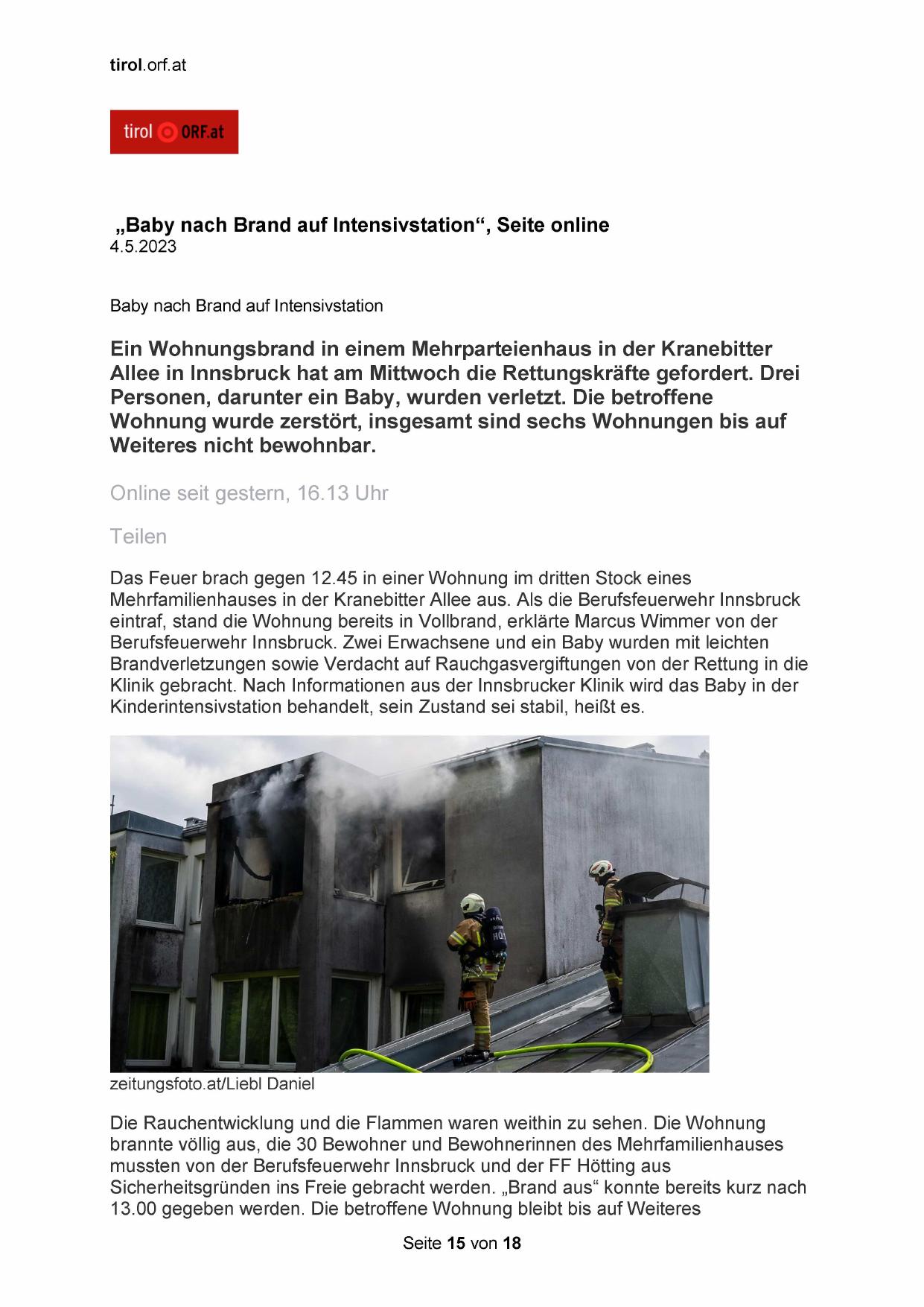 Mehrfamilienhauses in der Kranebitter Allee aus. Als die Berufsfeuerwehr Innsbruck