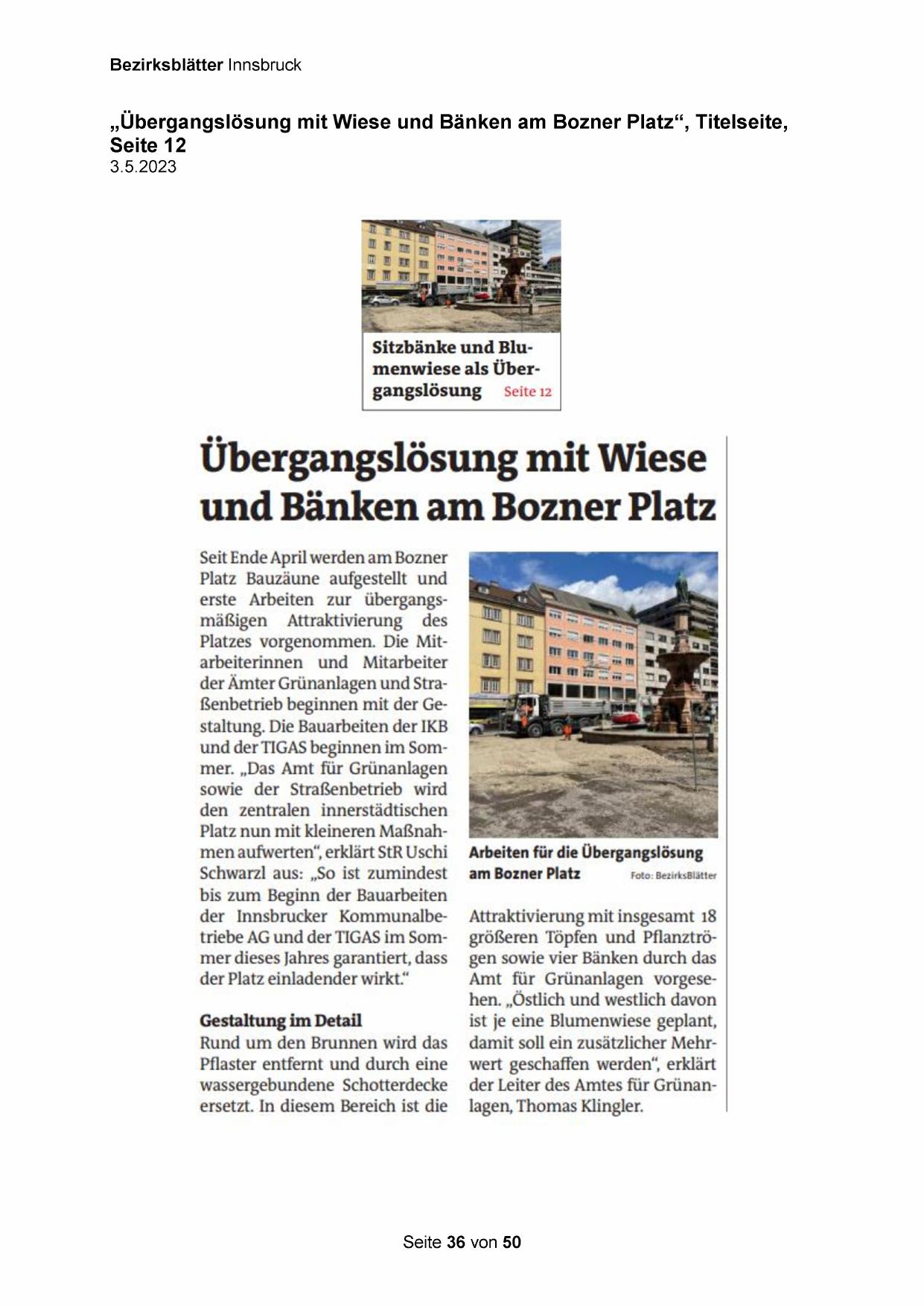 „Übergangslösung mit Wiese und Bänken am Bozner Platz“, Titelseite,