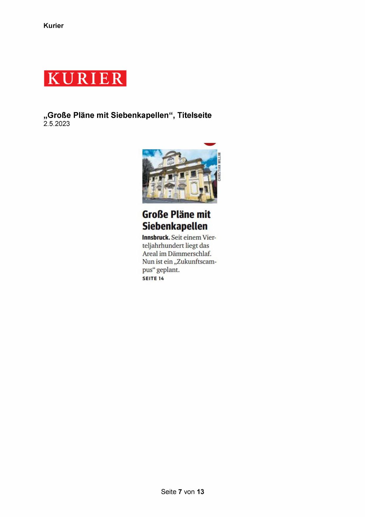 „Große Pläne mit Siebenkapellen“, Titelseite