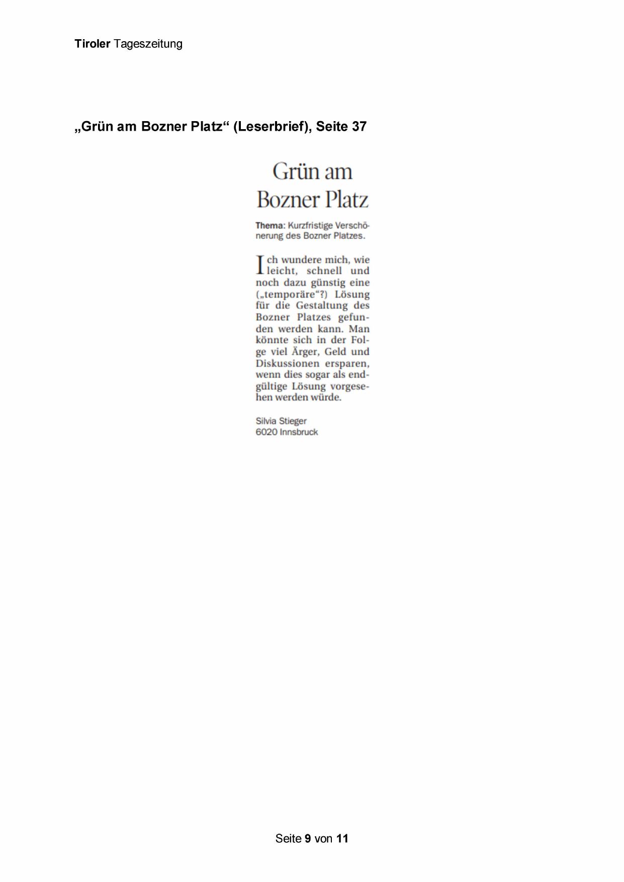 „Grün am Bozner Platz“ (Leserbrief), Seite 37