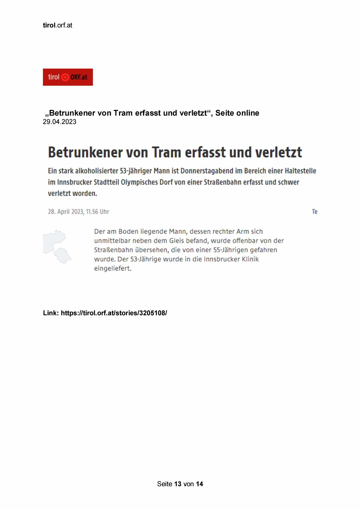 „Betrunkener von Tram erfasst und verletzt‘“, Seite online