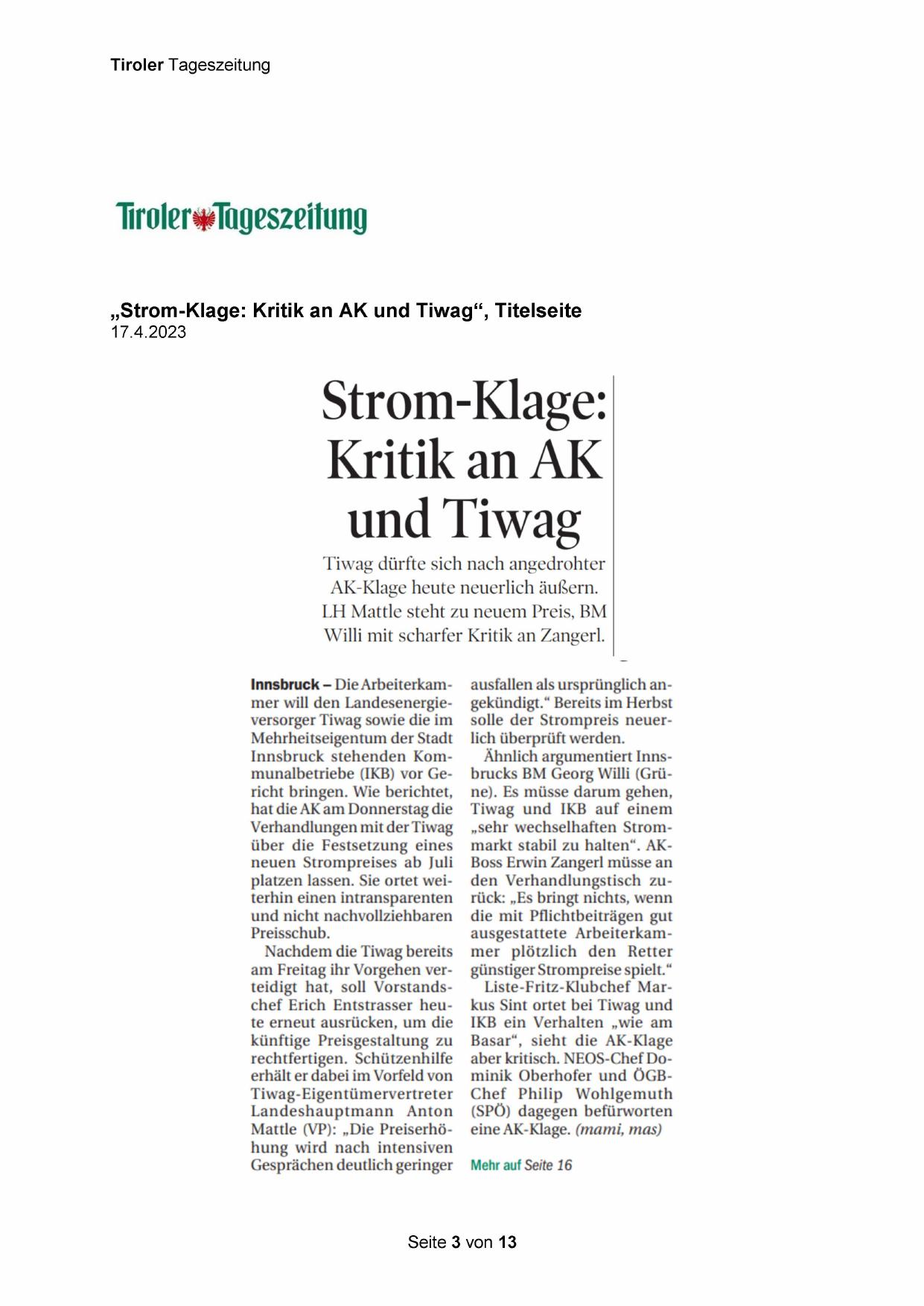 „Strom-Klage: Kritik an AK und Tiwag“, Titelseite