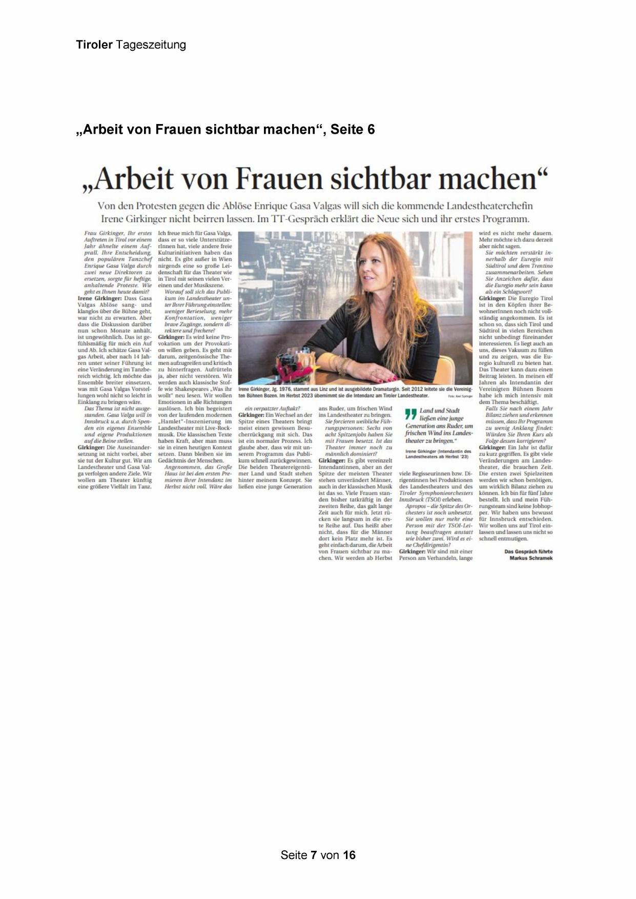 Irene Girkinger, Jg. 1976, stammt aus Linz und Ist ausgebildete Dramaturgin. Seit 2012 leitete sie die Vereinigten Bühnen Bazen. Im Herbst 2023 übernimmt sie die Iintendanz am Timler Landestheater.