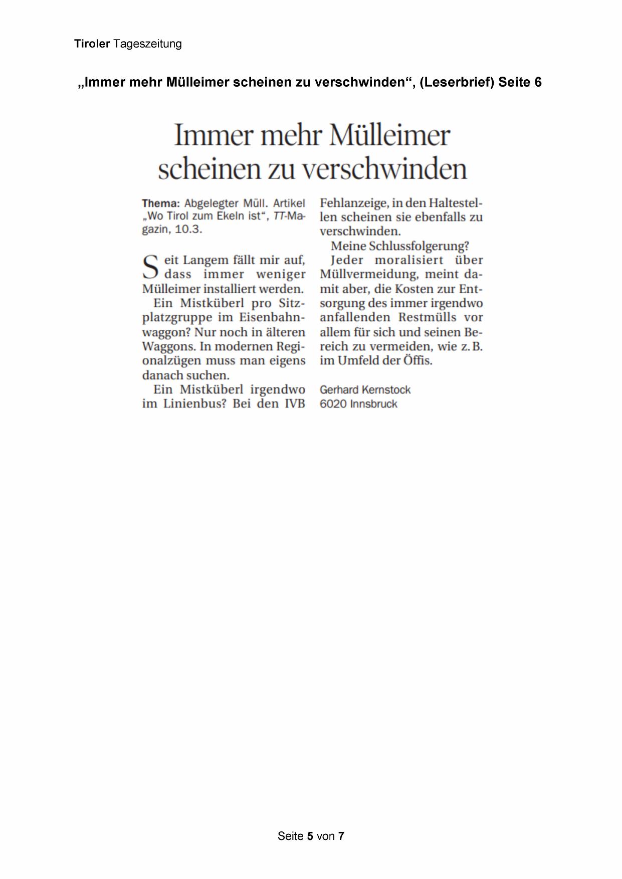 „Immer mehr Mülleimer scheinen zu verschwinden“, (Leserbrief) Seite 6