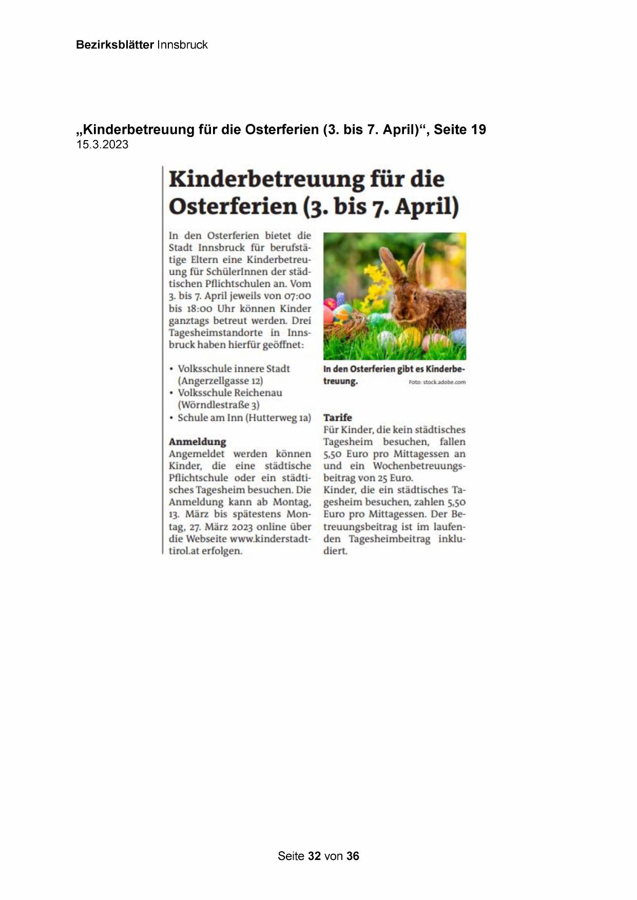 Stadt Innsbruck für berufstätige Eltern eine Kinderbetreuung für SchülerInnen der städtischen Pflichtschulen an. Vom