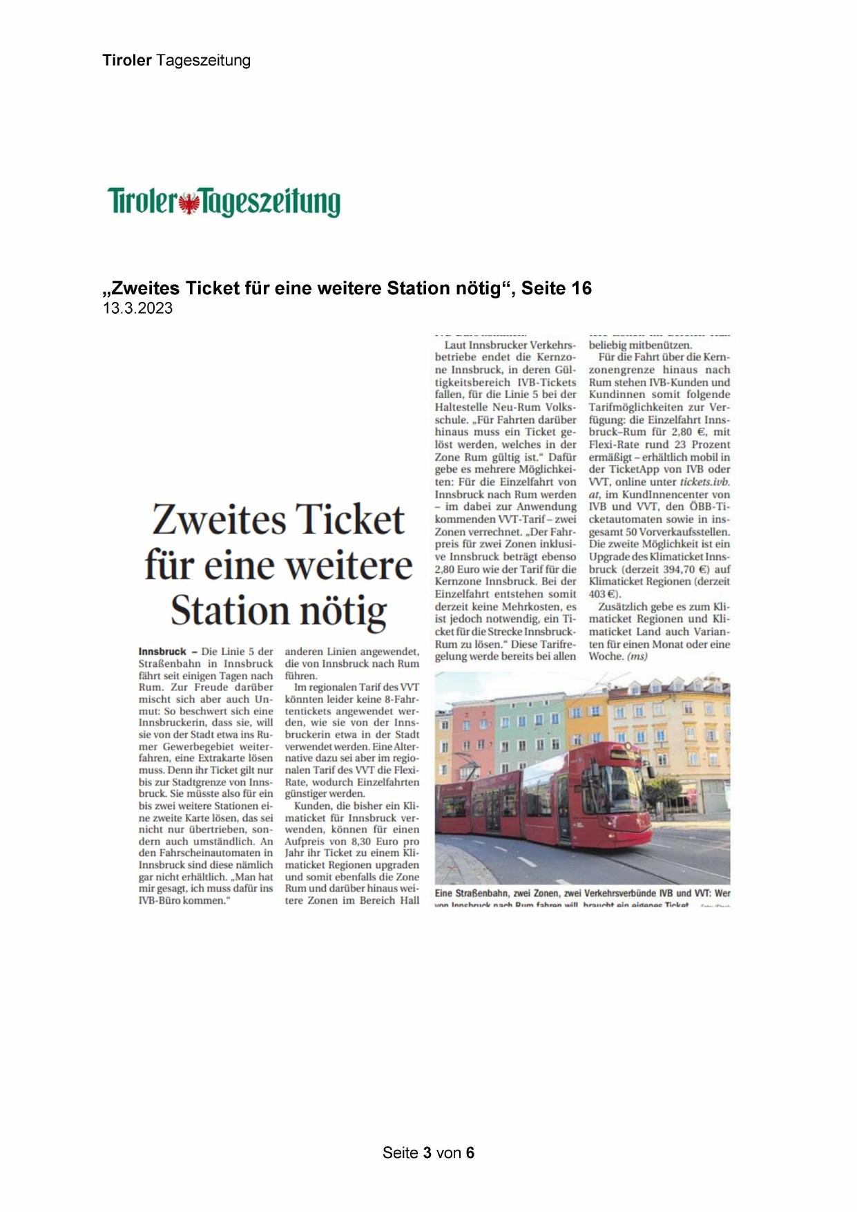 Zonen verrechnet. „Der Fahrpreis für zwei Zonen inklusive Innsbruck beträgt ebenso