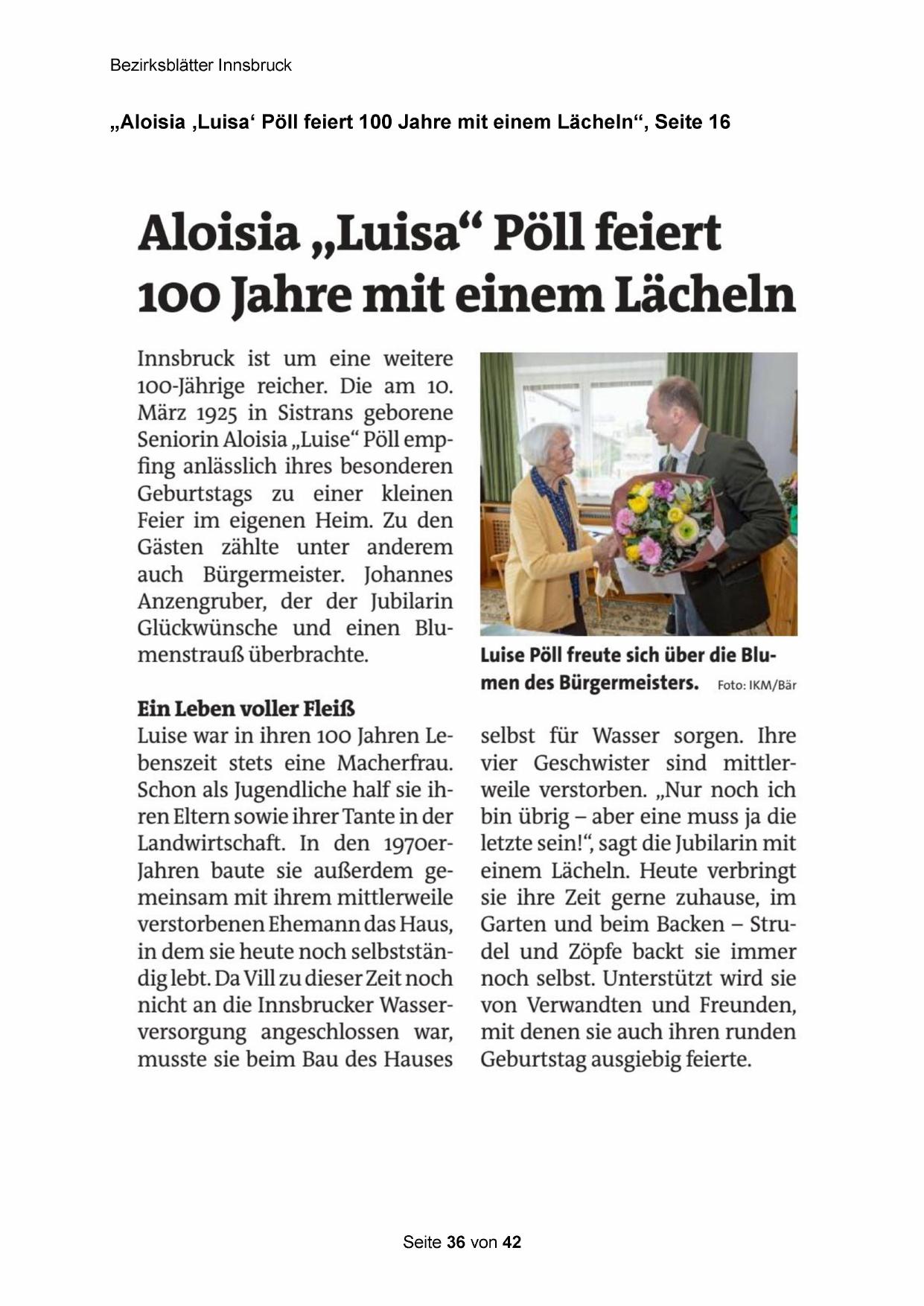 „Aloisia ‚Luisa‘ Pöll feiert 100 Jahre mit einem Lächeln“, Seite 16