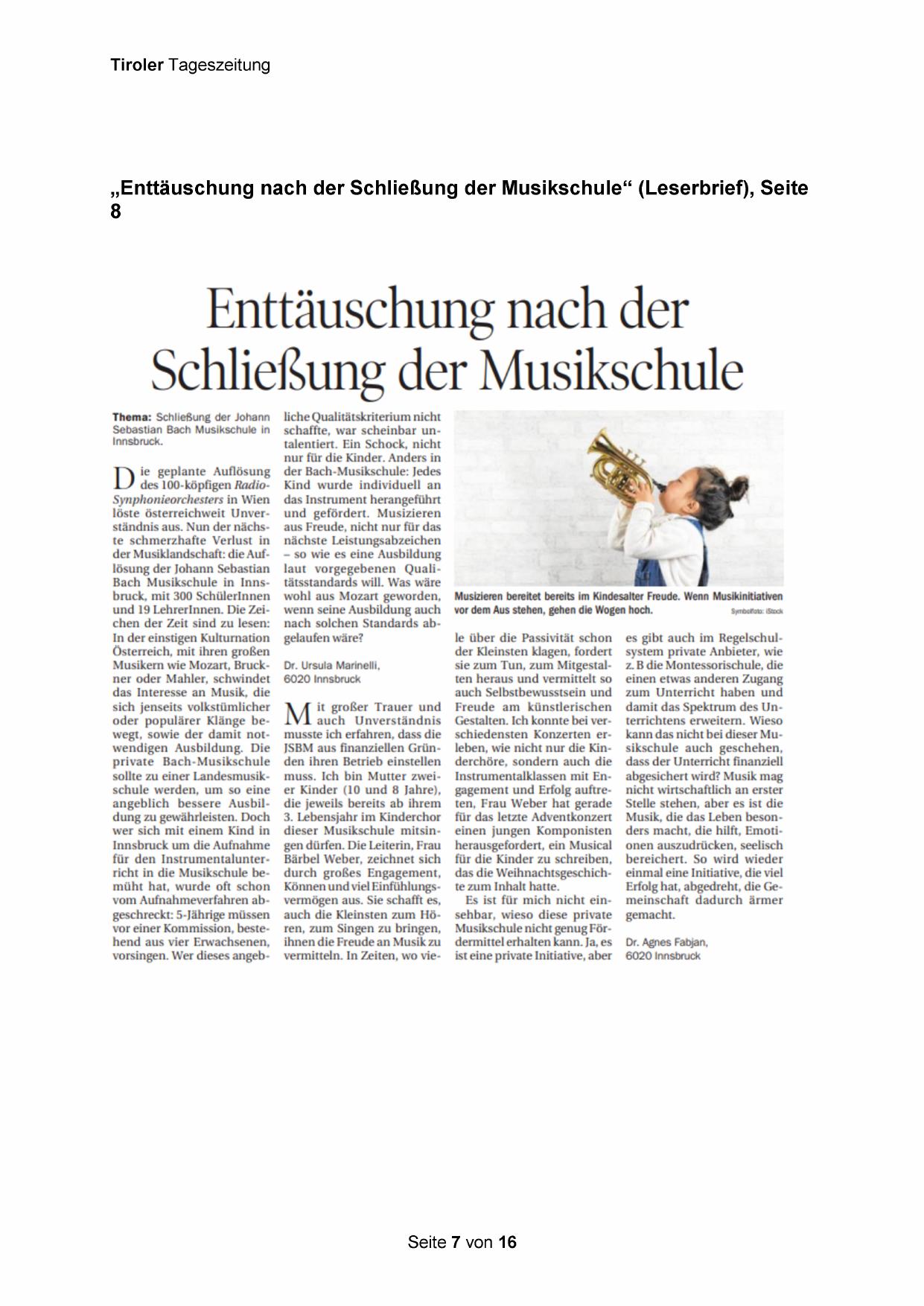 „Enttäuschung nach der Schließung der Musikschule“ (Leserbrief), Seite