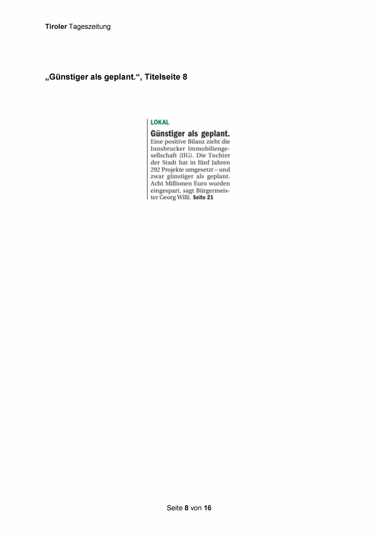 „Günstiger als geplant.“, Titelseite 8