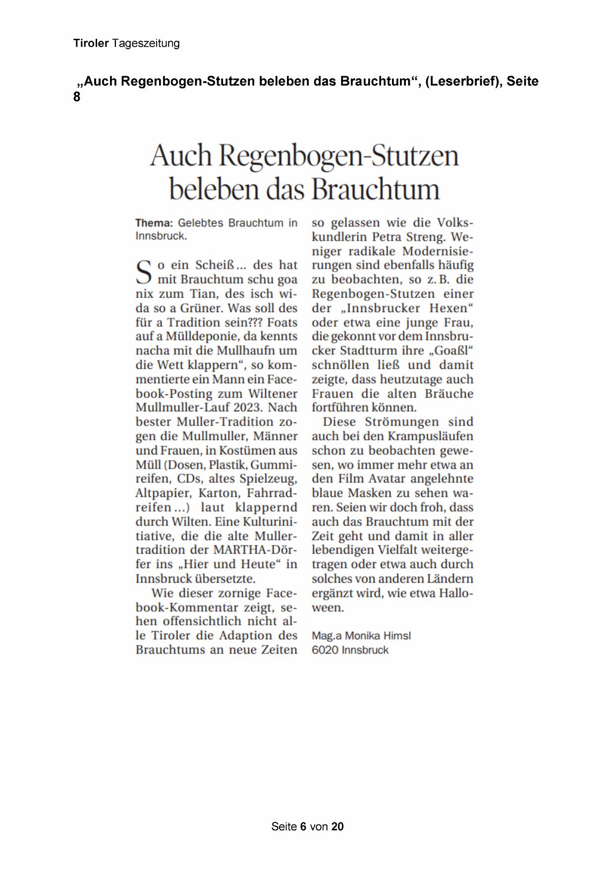 „Auch Regenbogen-Stutzen beleben das Brauchtum“, (Leserbrief), Seite