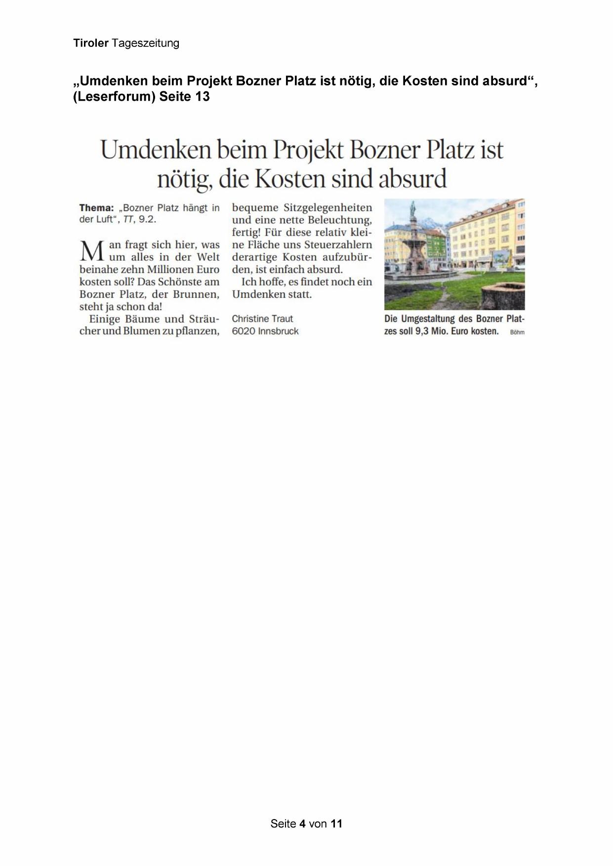 „Umdenken beim Projekt Bozner Platz ist nötig, die Kosten sind absurd“,
