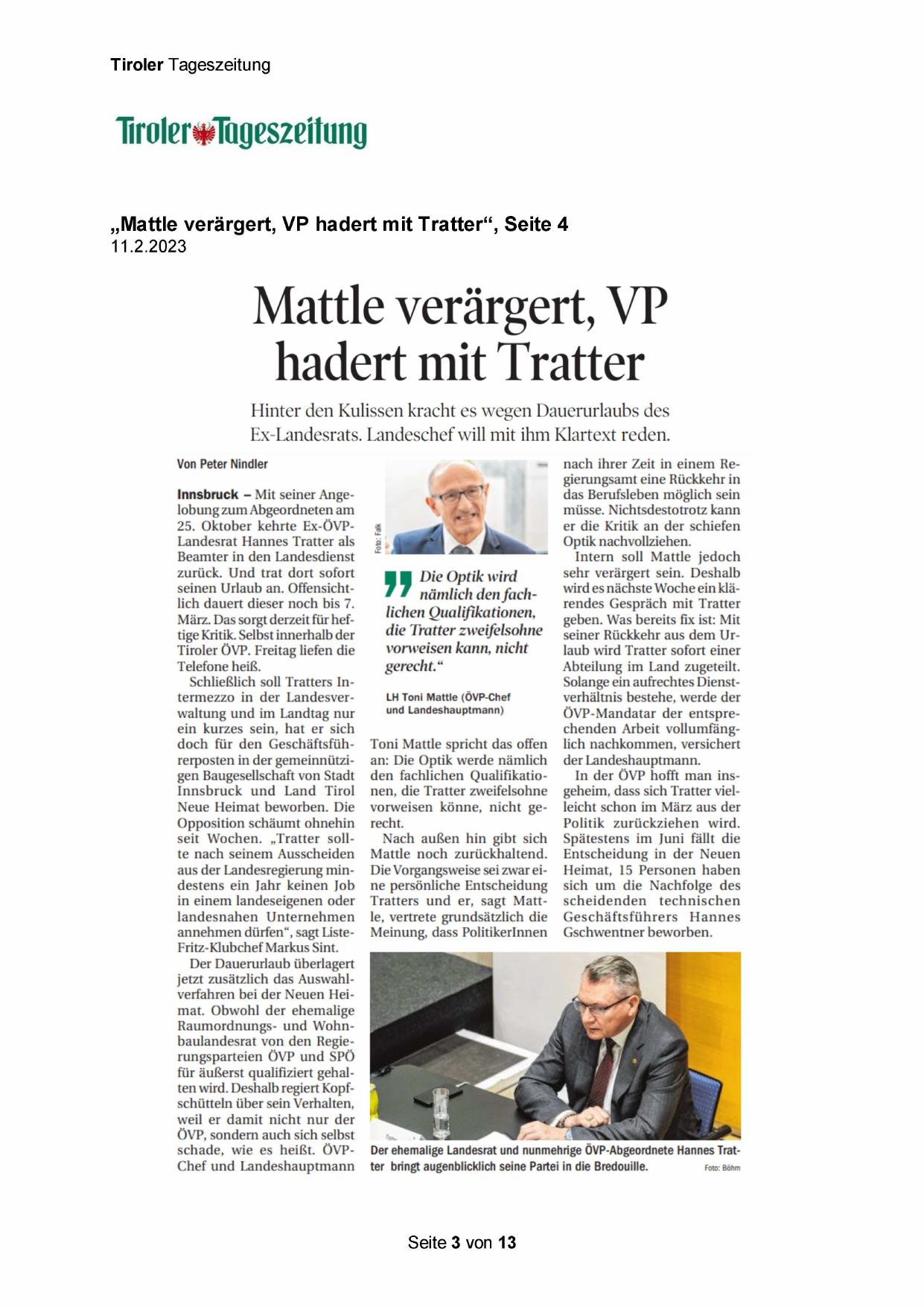 „Mattle verärgert, VP hadert mit Tratter“, Seite 4
