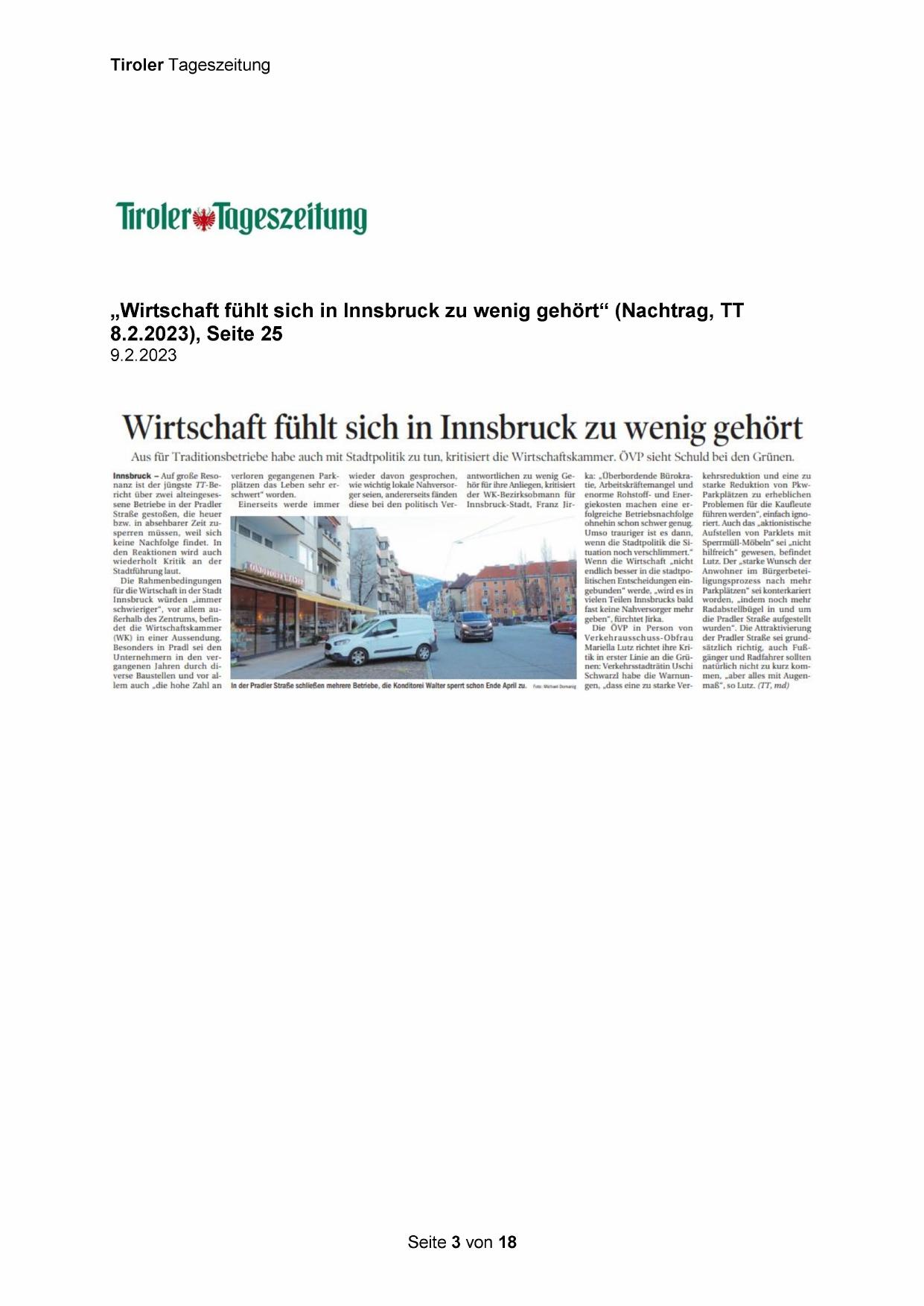 „Wirtschaft fühlt sich in Innsbruck zu wenig gehört“ (Nachtrag, TT