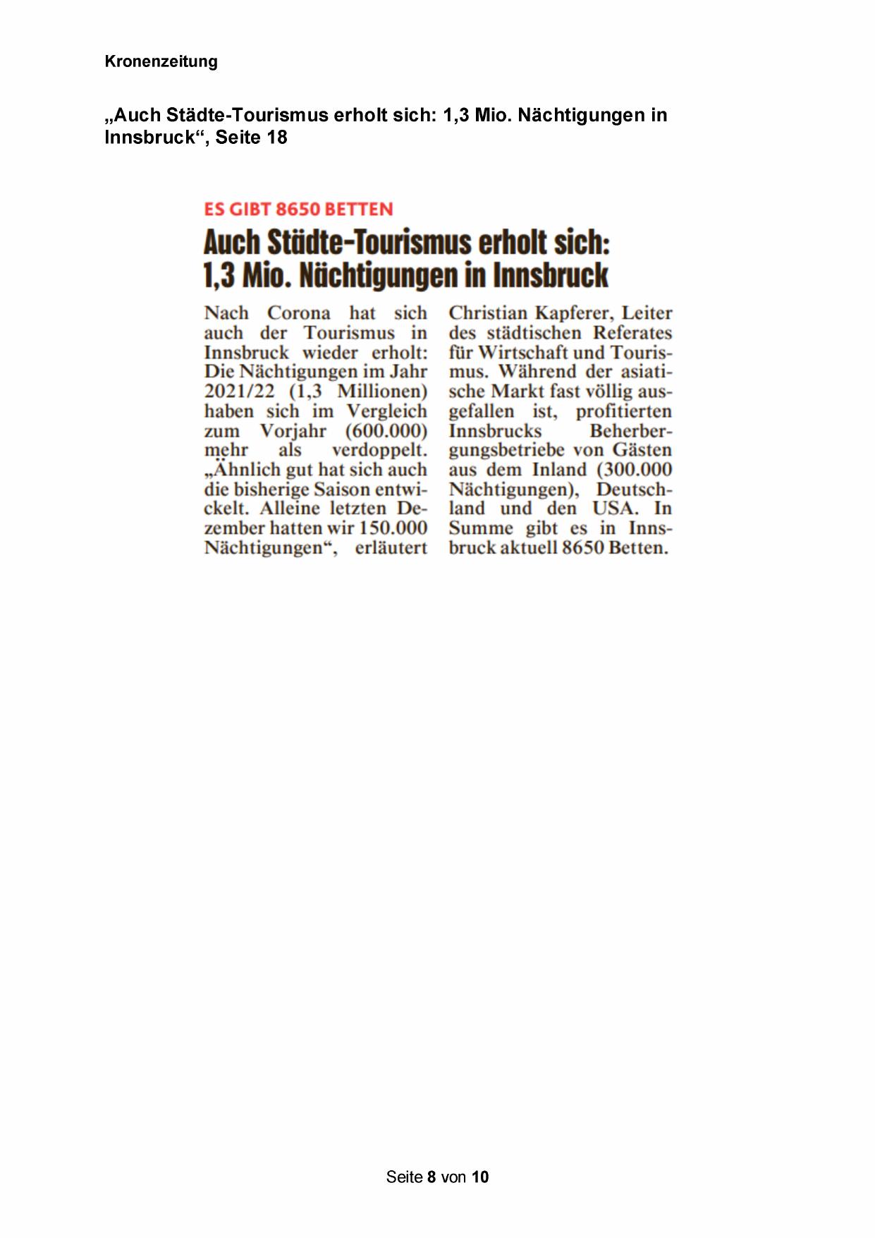 Summe gibt es in Innsbruck aktuell 8650 Betten.