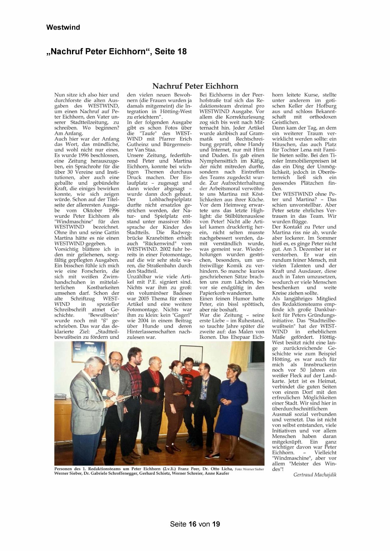des Redaktionsteams empfinde ich große Dankbarkeit für Peters Gründungsinitiative. Das "Stadtteilbewußtsein" hat der WEST-